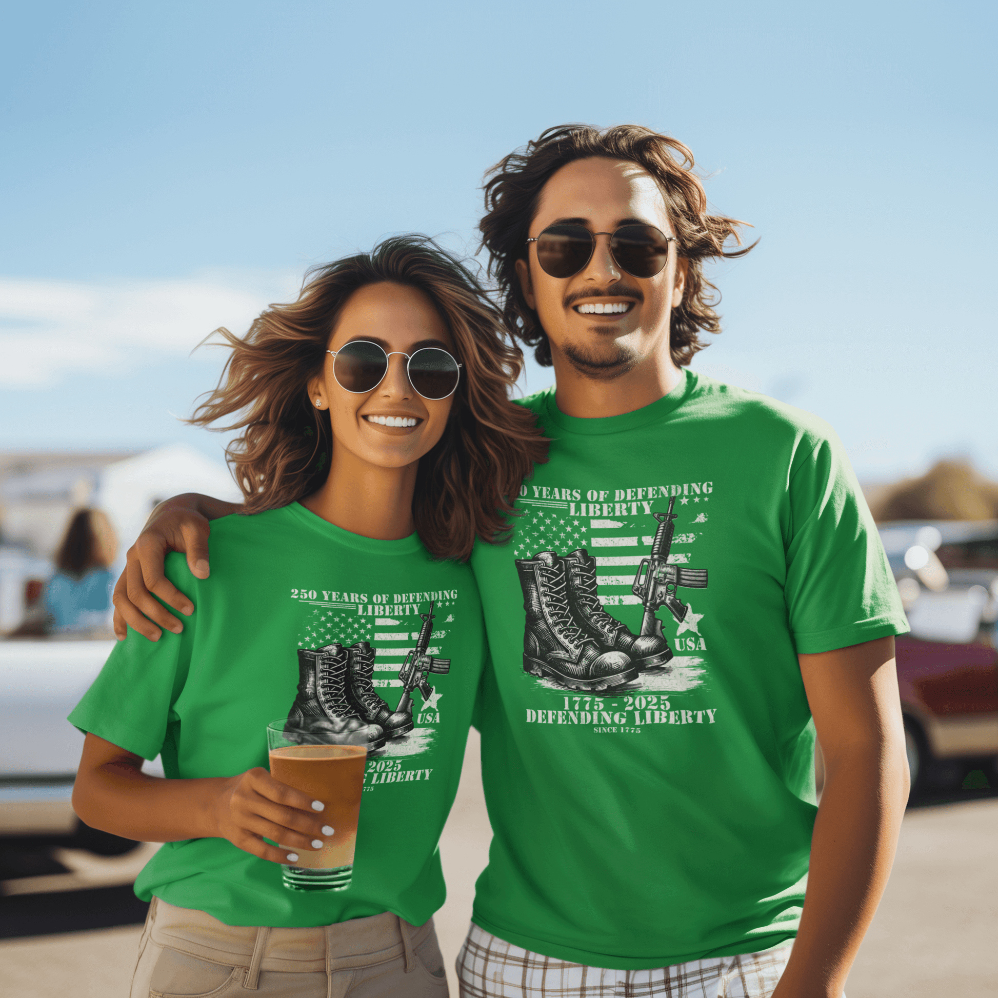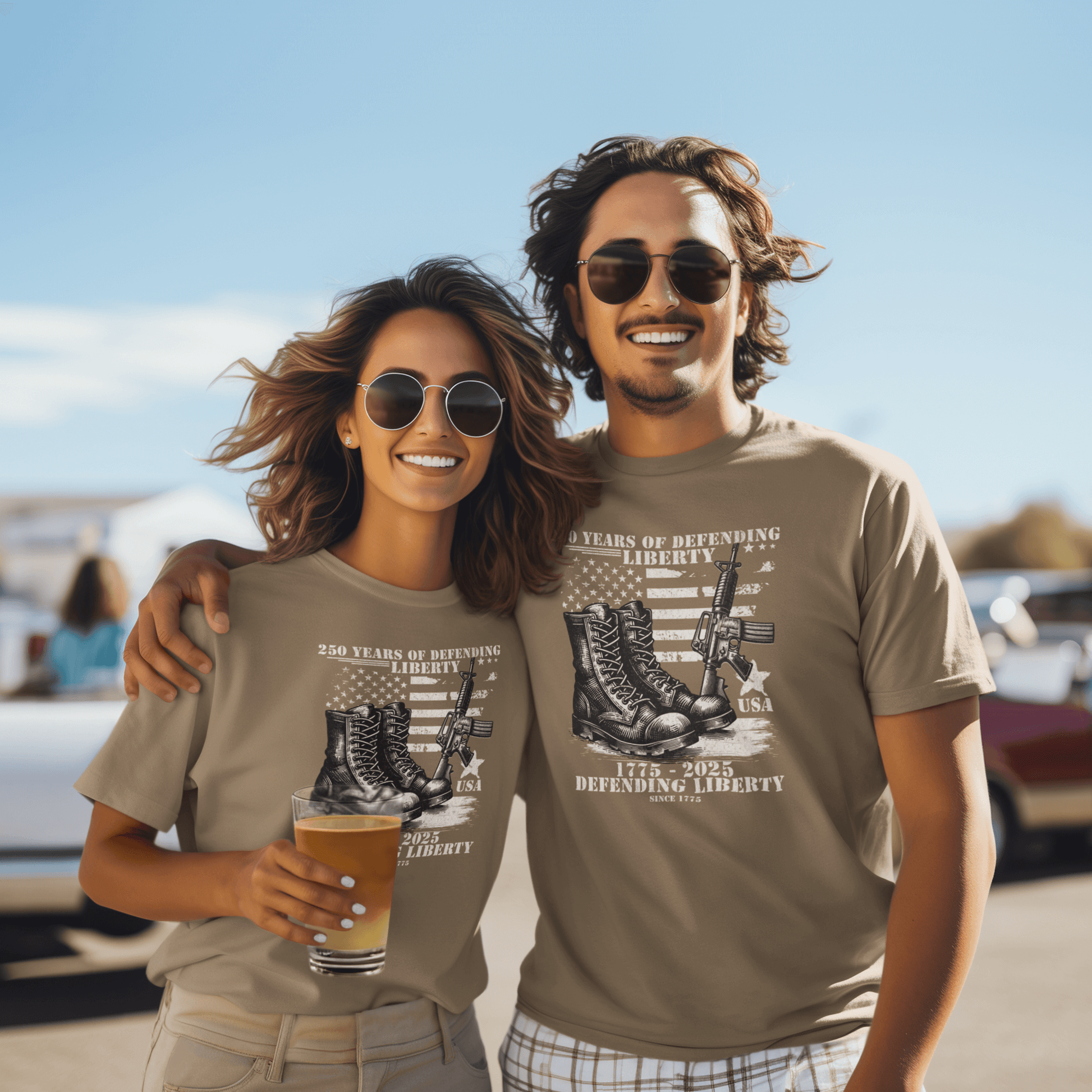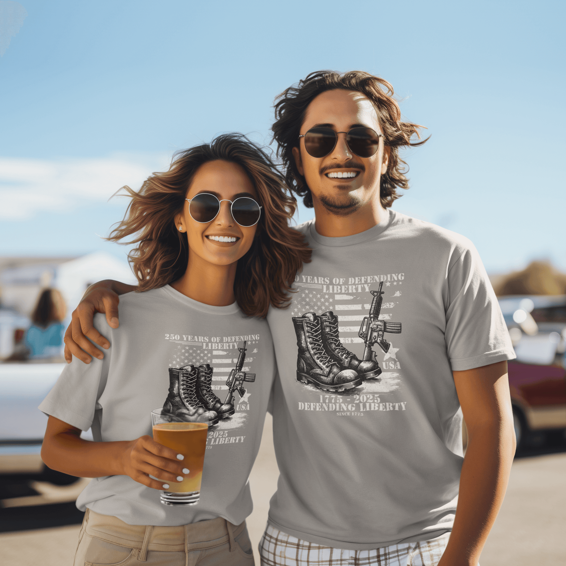 For 250 years, Americans have stood the line so freedom could stand tall. This bold, battle-ready design honors the warriors who’ve defended liberty since 1775—no excuses, no apologies. Featuring iconic boots, steel, and the flag, this shirt is made for those who respect the cost of freedom and aren’t afraid to show it. Wear it with pride. Freedom is never free—and it’s always worth defending.