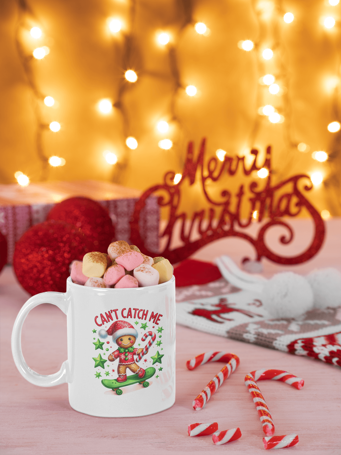 This playful ceramic Christmas mug comes in 12 oz and 15 oz sizes. It is perfect for anyone who loves a little festive mischief! Featuring a gingerbread man zooming by on a skateboard with the phrase "Can't Catch Me," this design puts a modern twist on the classic holiday story. It's great for skateboard enthusiasts, fans of sweet treats, or anyone who likes to show off their quick wit (and maybe quick feet) during the holiday season. Who needs a sleigh when you’ve got wheels?