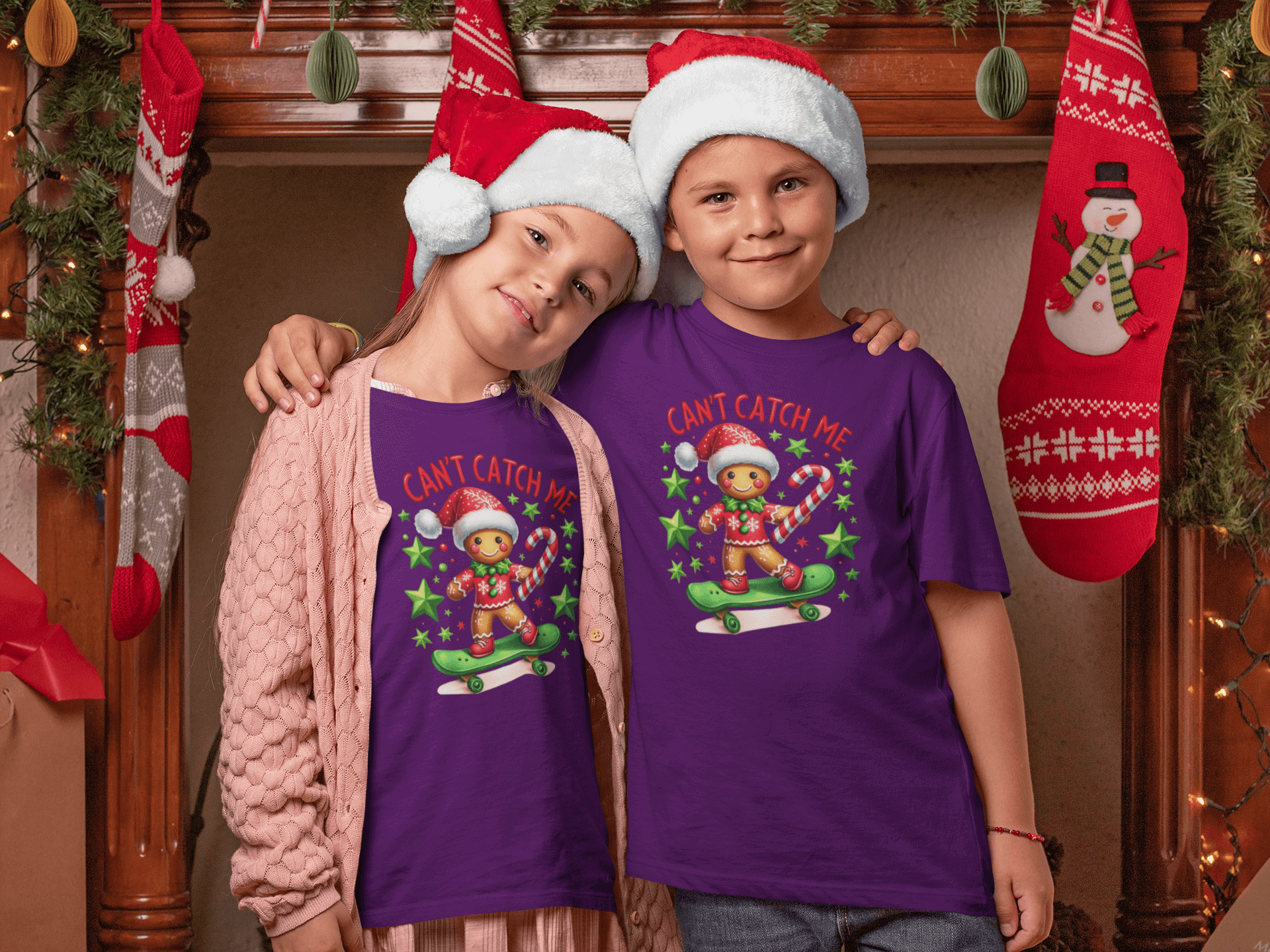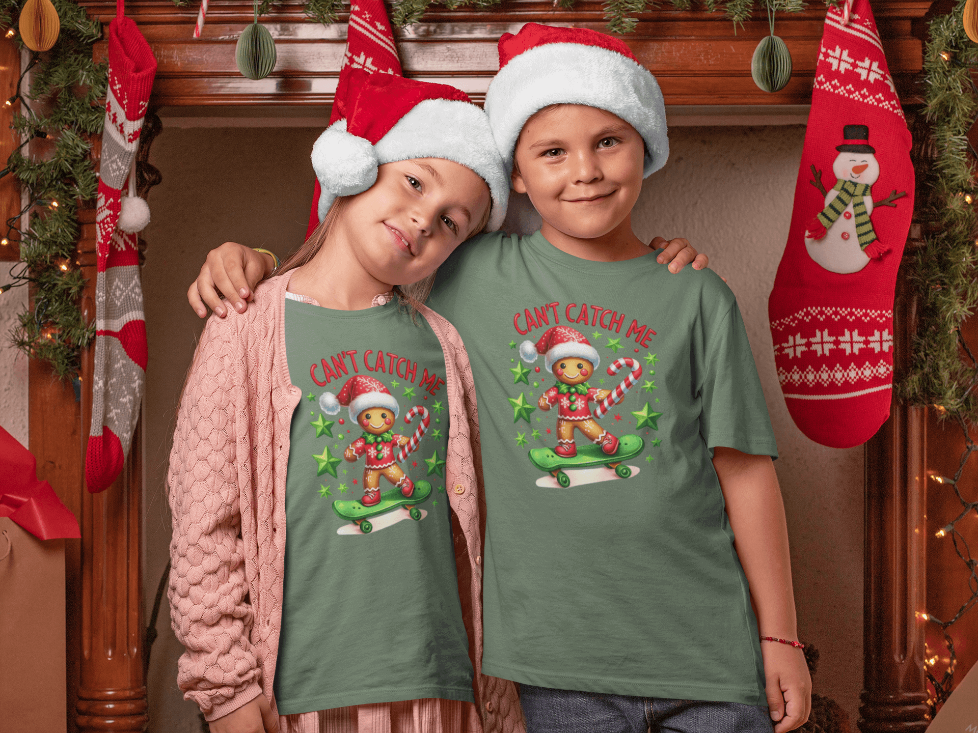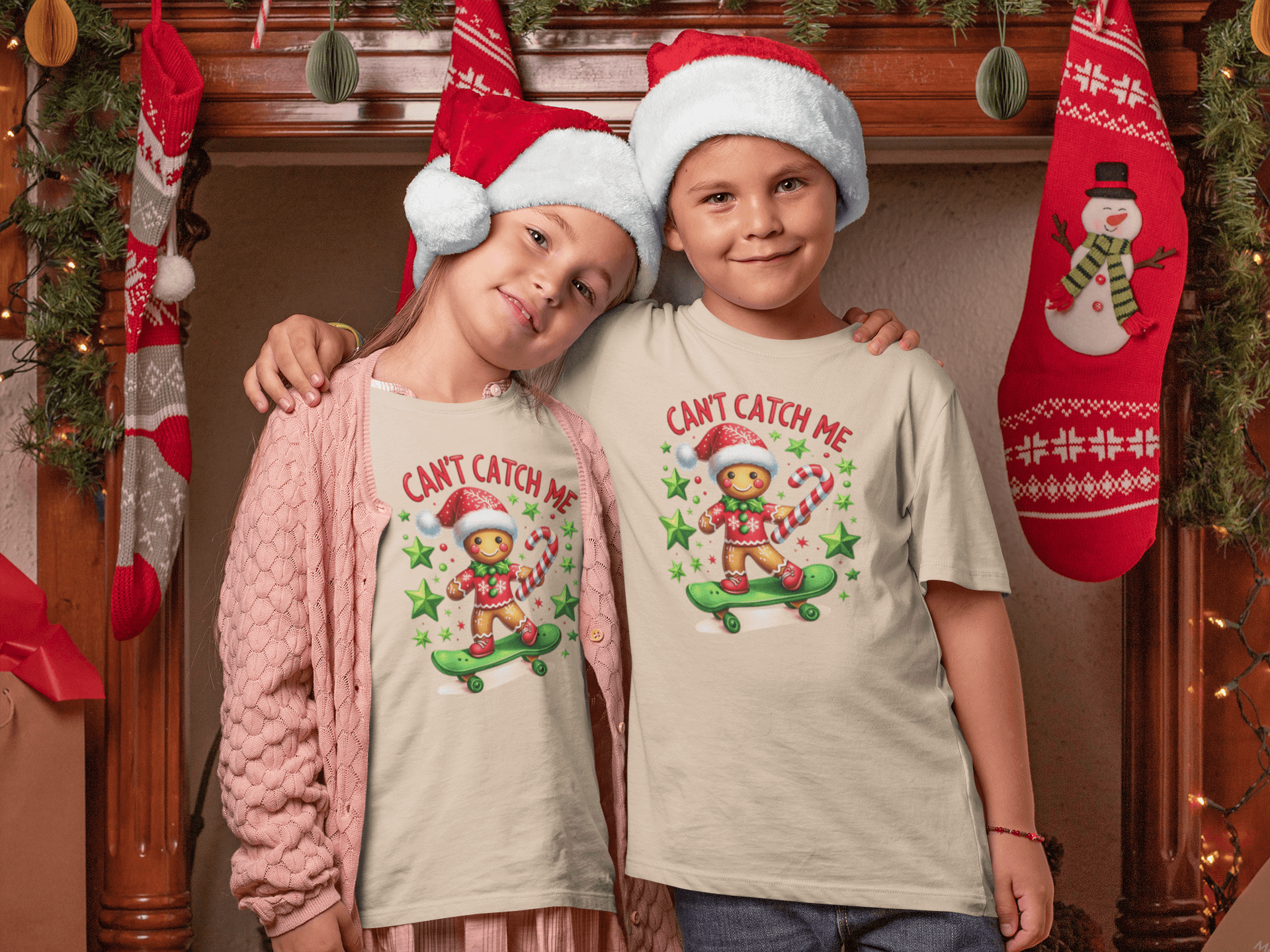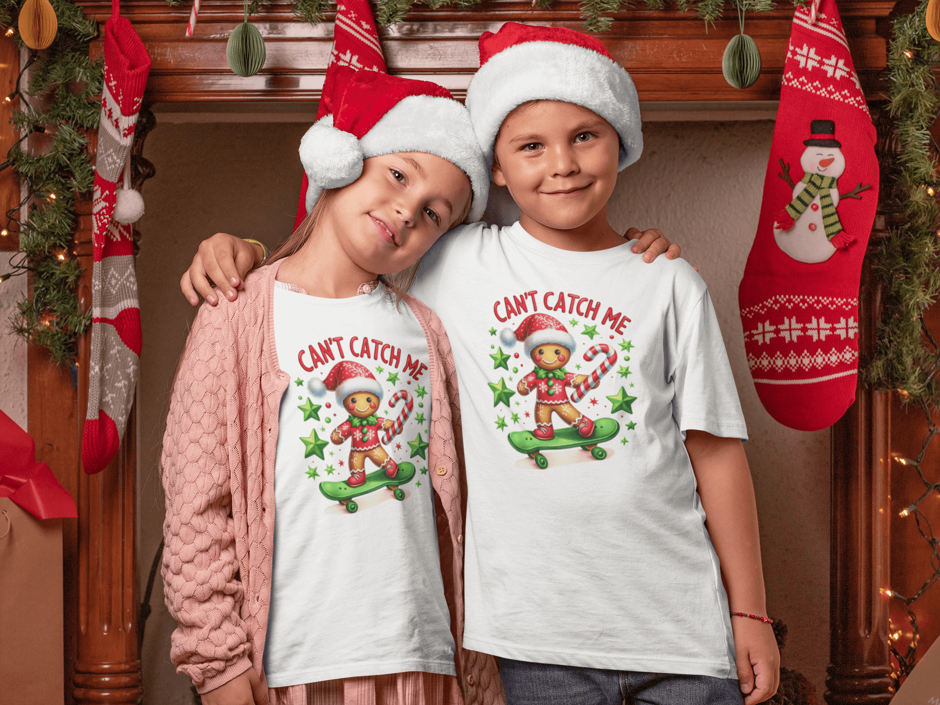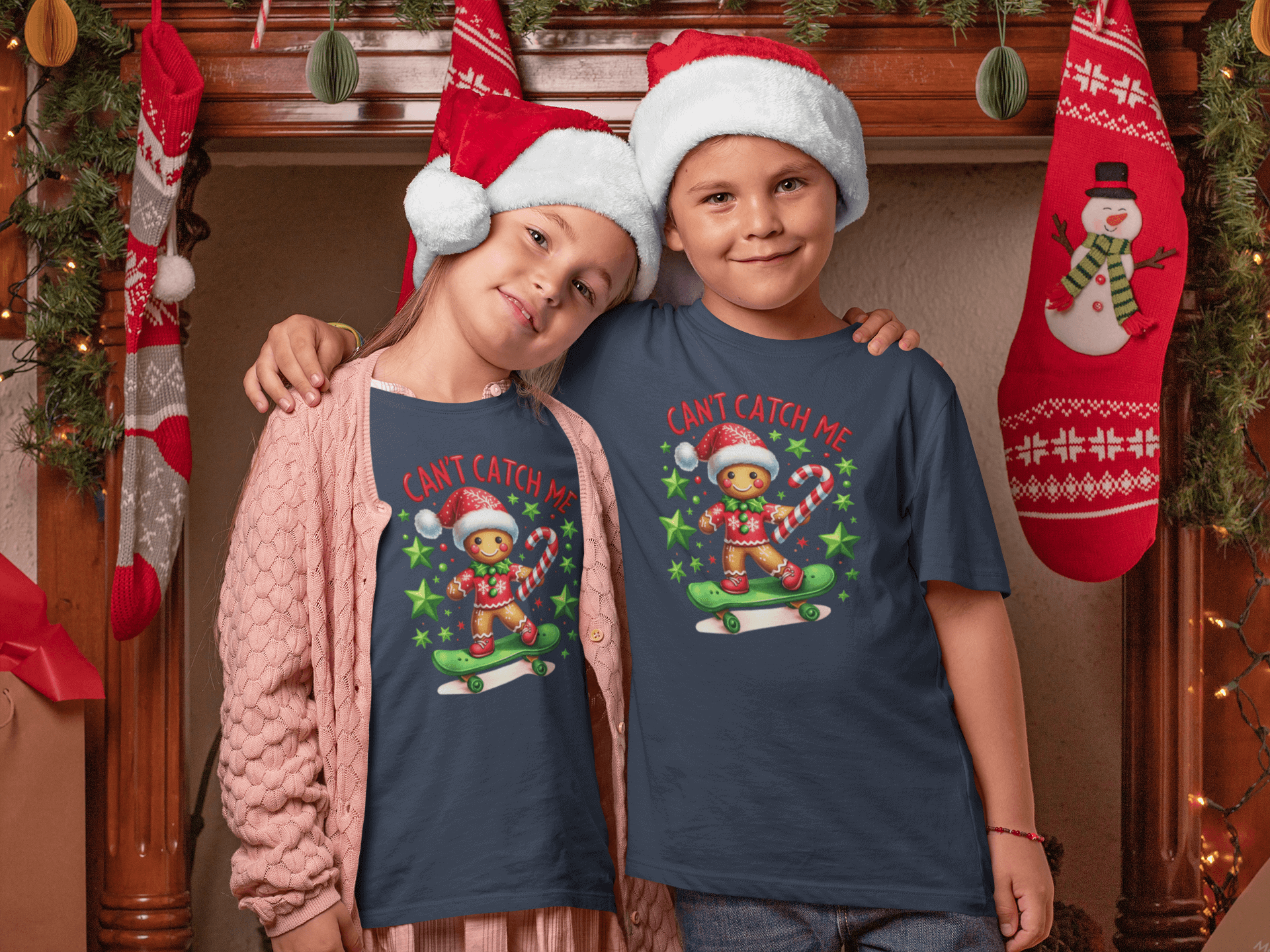 This playful Christmas T-shirt is perfect for anyone who loves a little festive mischief! Featuring a gingerbread man zooming by on a skateboard with the phrase "Can't Catch Me," this design puts a modern twist on the classic holiday story. It's great for skateboard enthusiasts, fans of sweet treats, or anyone who likes to show off their quick wit (and maybe quick feet) during the holiday season. Soft, comfy, and bursting with personality, this shirt is sure to bring smiles at Christmas parties or while unwrapping gifts. Who needs a sleigh when you’ve got wheels?