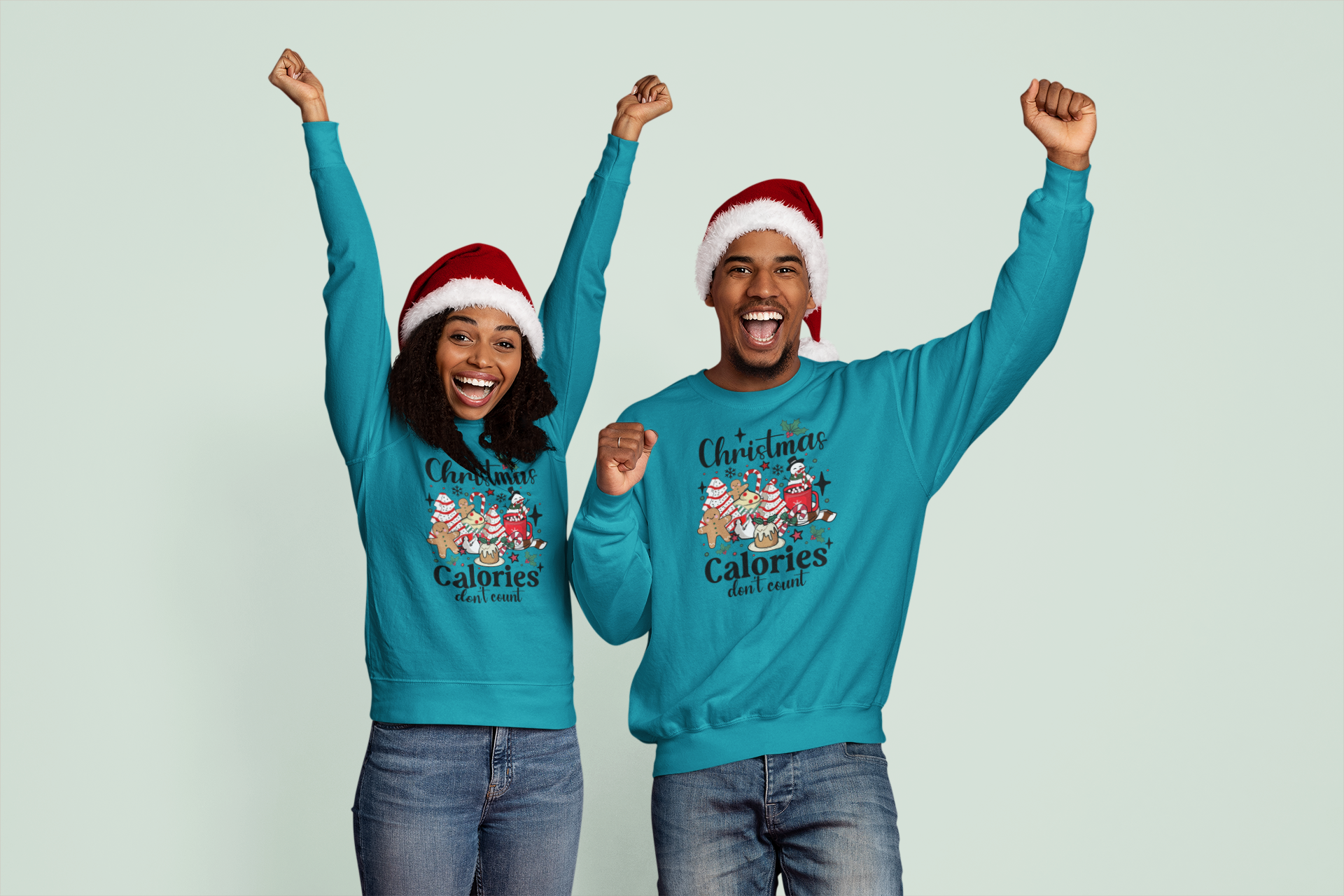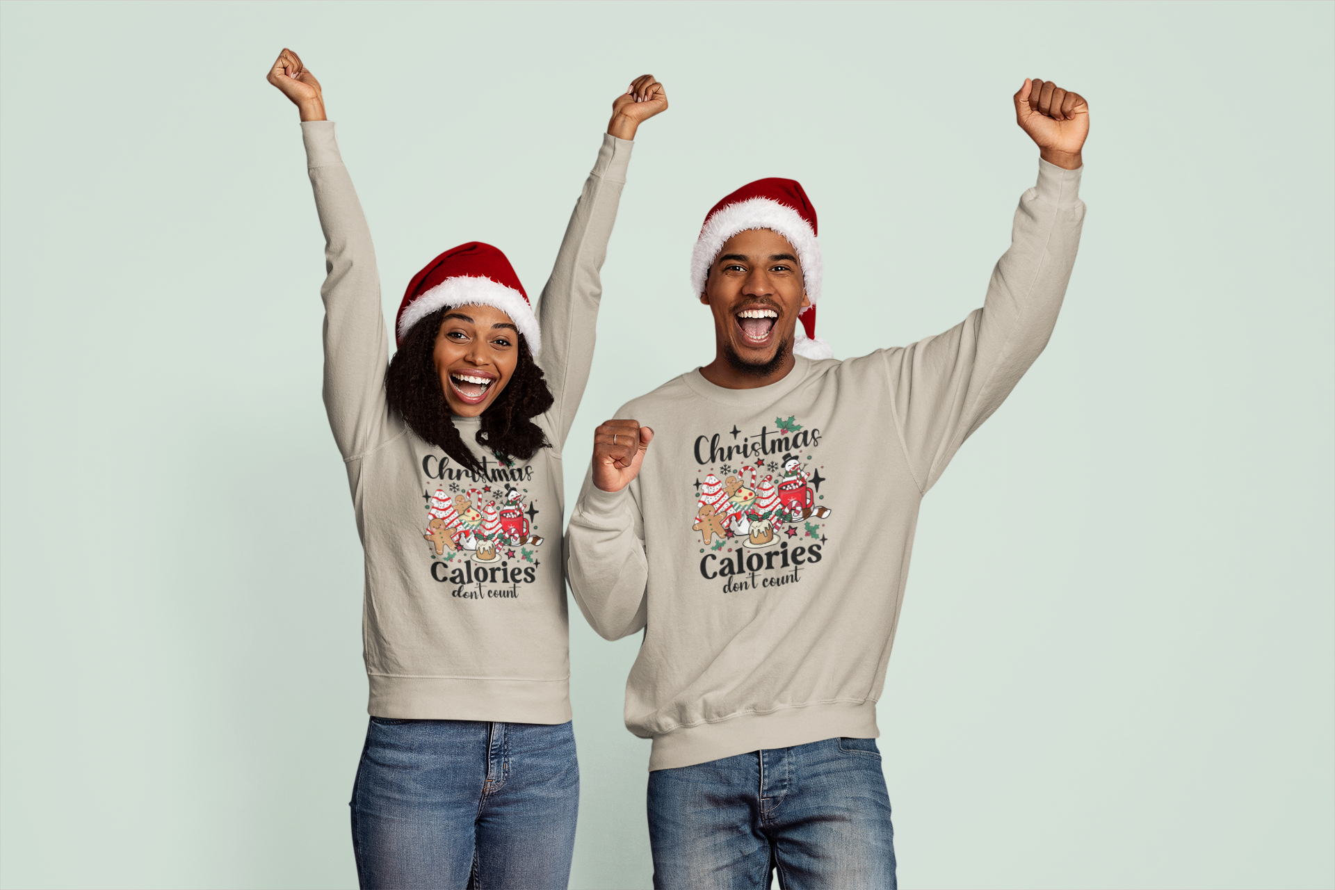 Indulge guilt-free this holiday season with our 'Christmas Calories Don’t Count' sweatshirt Featuring festive treats like gingerbread cookies, candy canes, hot cocoa, and holiday accents, this playful design is perfect for anyone embracing the season's sweet and savory delights. Whether you're at a party or cozy by the fire, this sweatshirt reminds everyone to enjoy the holidays to the fullest. Grab yours today and celebrate the tastiest time of the year in style!