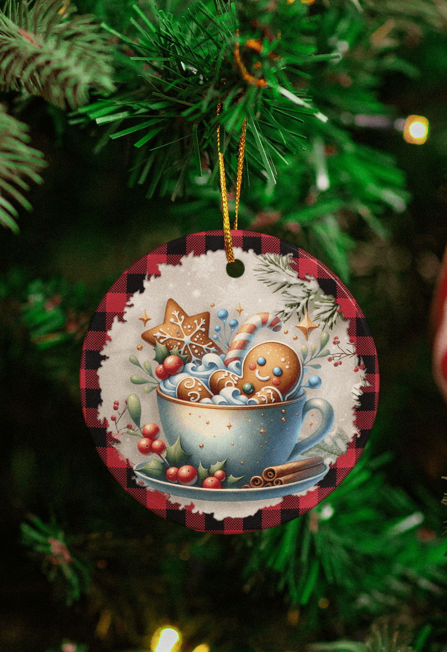 Celebrate the cozy charm of the holiday season with the "Gingerbread Delight Ornament Set," featuring four delightful designs of gingerbread characters nestled in festive mugs. Each ceramic ornament showcases intricate details, from candy canes to steaming cups of cocoa, all framed in a cozy plaid border. Perfect for adding warmth and sweetness to your tree or gifting to a loved one, this set is a must-have for your holiday décor. Bring this cheerful collection to your home today! Ornaments sold as a set, not individually.