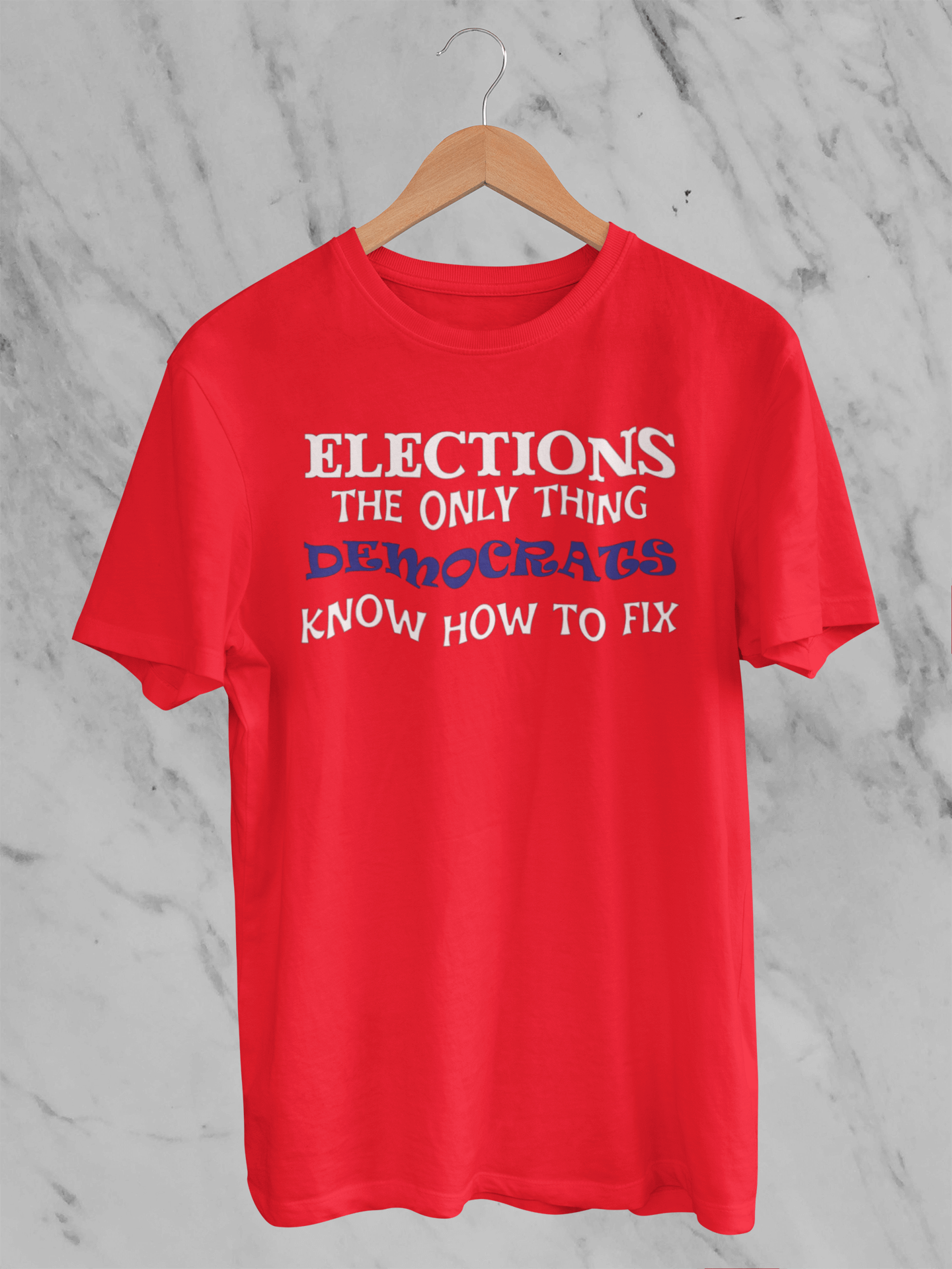 A Playful Statement: This shirt humorously suggests that elections are the one thing Democrats seem to "fix," making it a witty addition to your wardrobe for political discussions. So funny, because it's TRUE.