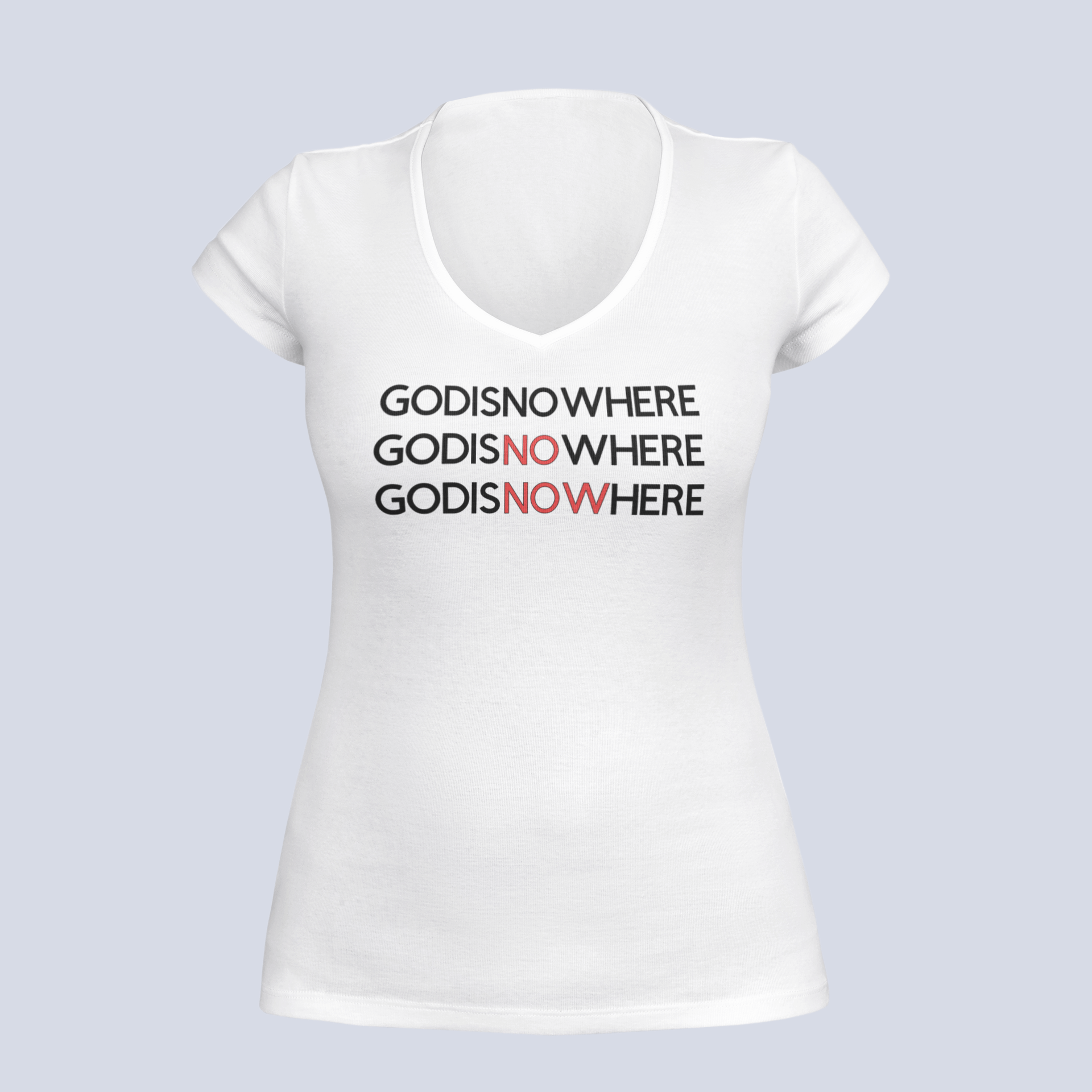 Embark on a visual and spiritual journey with "Godisnowhere" – a captivating enigma wrapped in cotton. In the intricate dance of letters, 'NO' boldly asserts doubt, while 'NOW' serenely whispers belief.