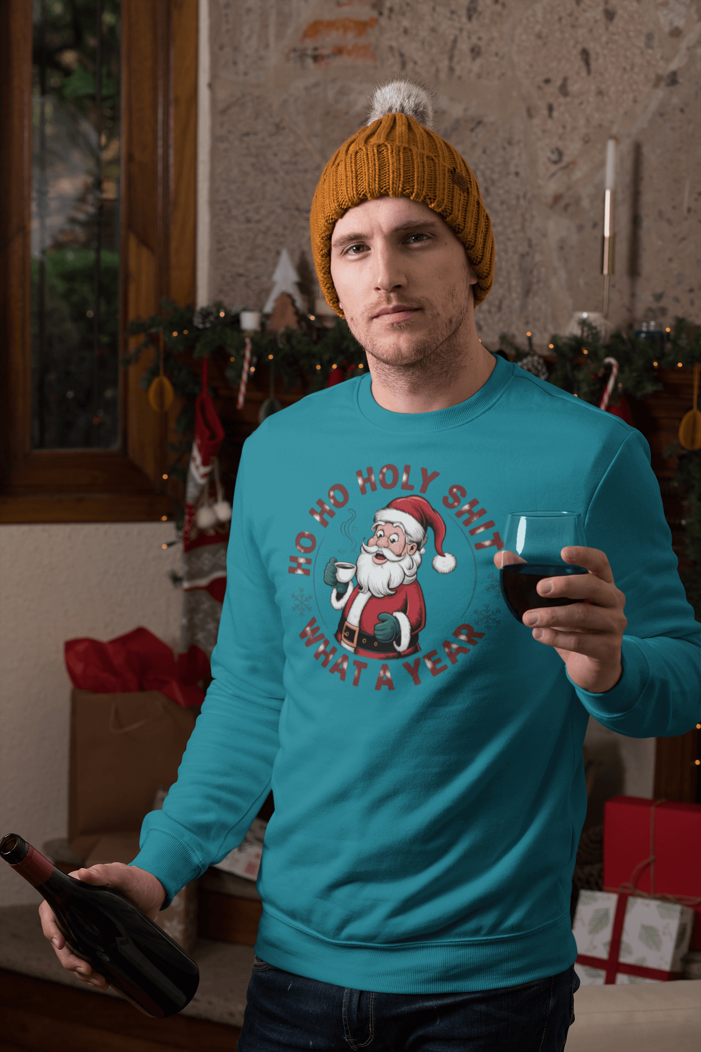 Wrap up the year with a laugh in our 'Ho Ho Holy Sh*t, What a Year' Sweatshirt! Featuring a jolly yet exasperated Santa enjoying a cup of something warm and strong, this design perfectly captures the chaos and humor of the season. With festive snowflake accents and bold lettering, it's ideal for holiday parties, gift exchanges, or anyone reflecting on a rollercoaster of a year. Grab yours today and end the year with a smile and a chuckle!