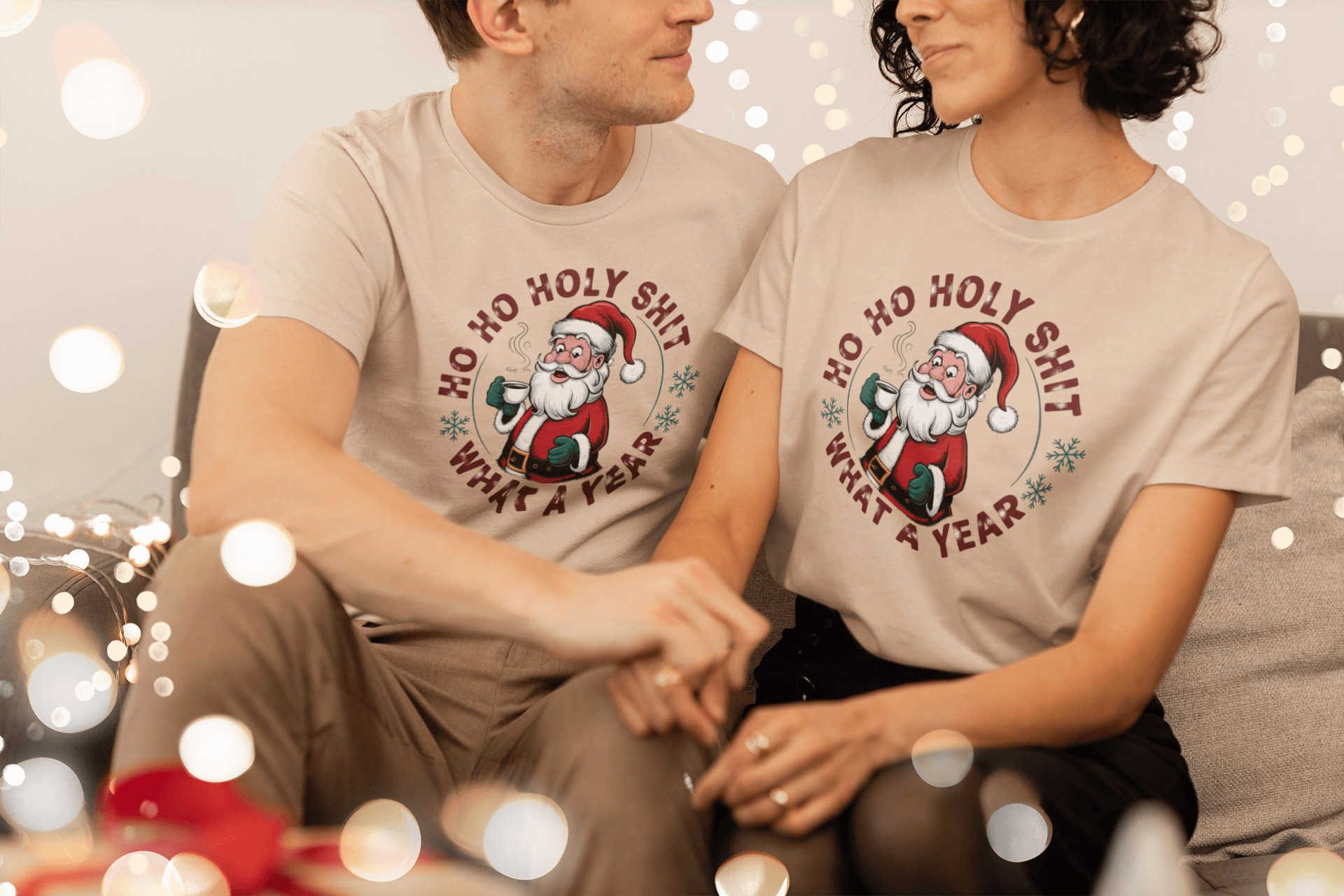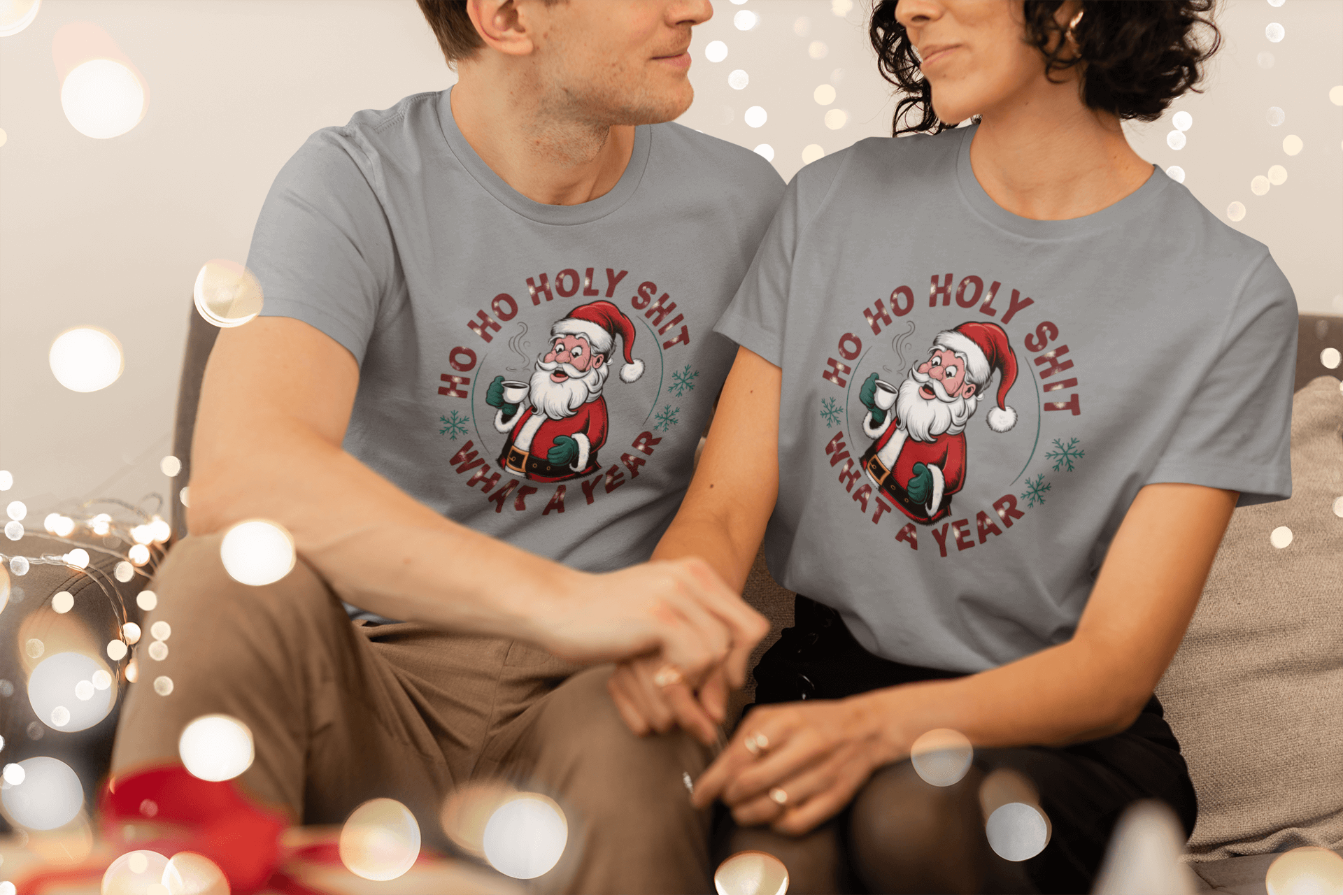 Wrap up the year with a laugh in our 'Ho Ho Holy Sh*t, What a Year' T-shirt! Featuring a jolly yet exasperated Santa enjoying a cup of something warm and strong, this design perfectly captures the chaos and humor of the season. With festive snowflake accents and bold lettering, it's ideal for holiday parties, gift exchanges, or anyone reflecting on a rollercoaster of a year. Grab yours today and end the year with a smile and a chuckle!
