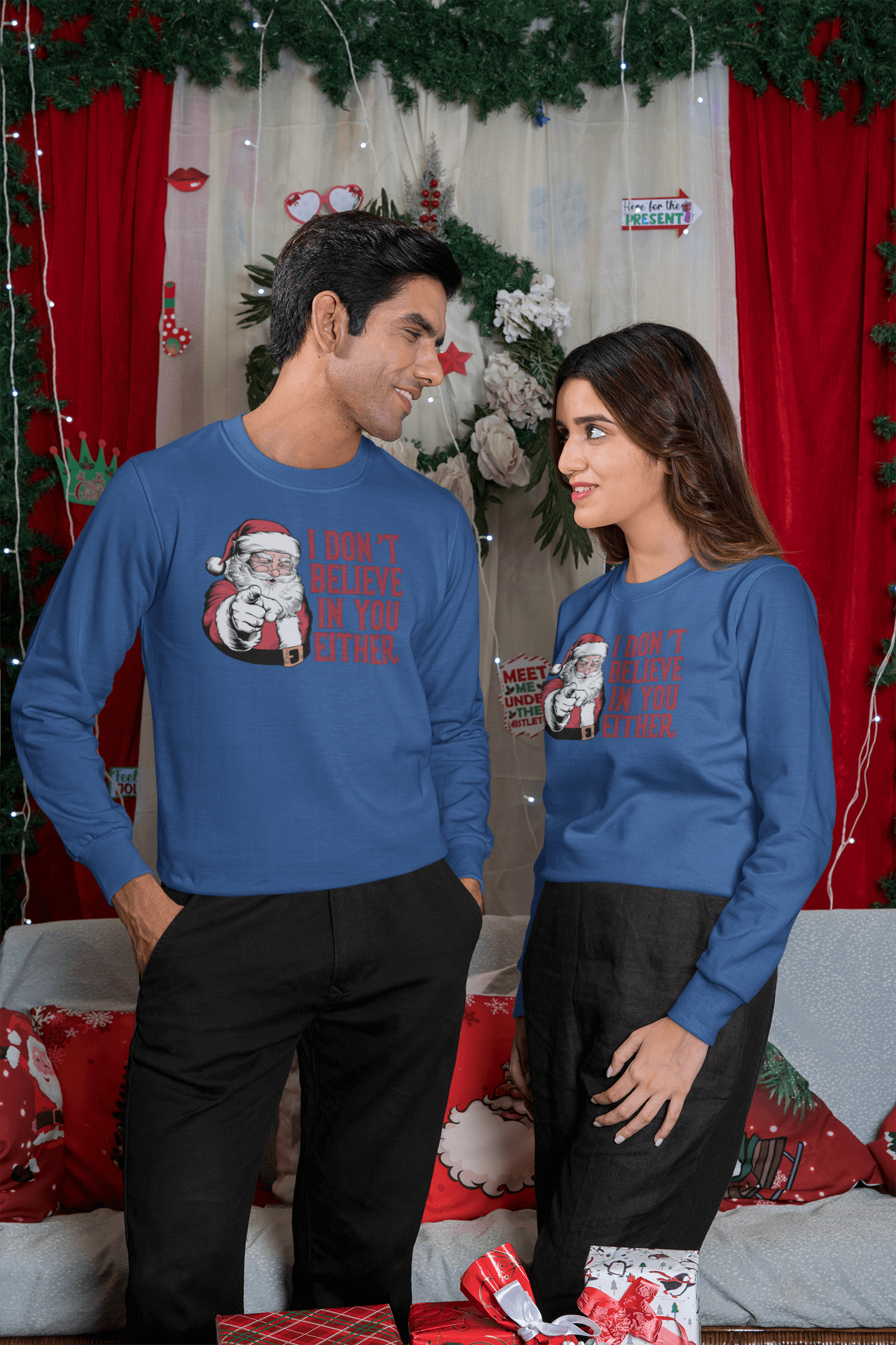 Add a dash of sass to your holiday wardrobe with this hilariously bold Sweatshirt! Featuring Santa himself delivering the ultimate mic drop with the phrase, "I Don’t Believe in You Either," this design is perfect for those who love their Christmas spirit with a side of humor. Whether you’re rocking it at a festive party or just making your friends and family chuckle, this sweatshirt is sure to stand out. Comfortable, cheeky, and perfect for those who appreciate a good laugh, it’s a must-have for anyone looking to shake up the holiday cheer!