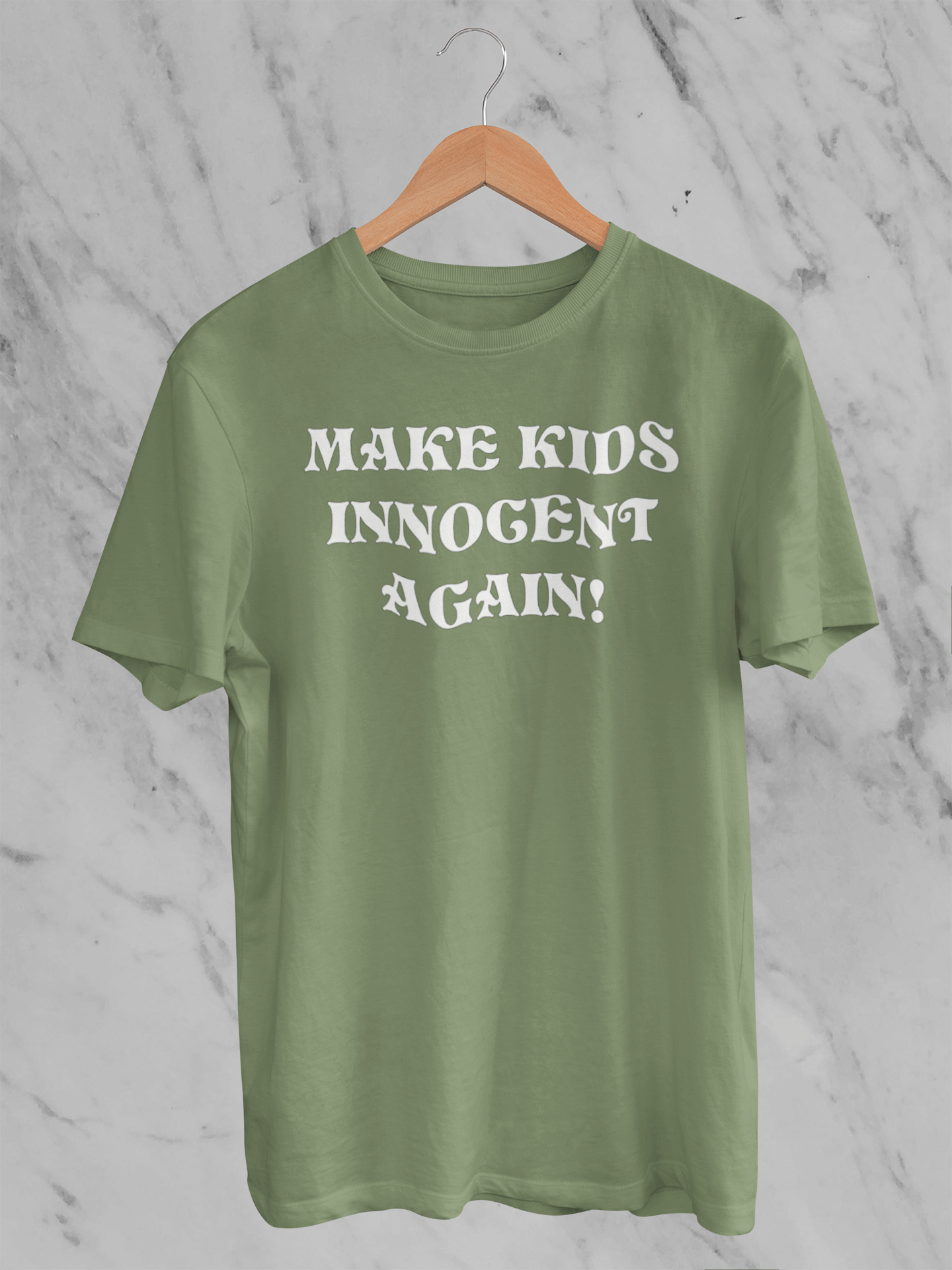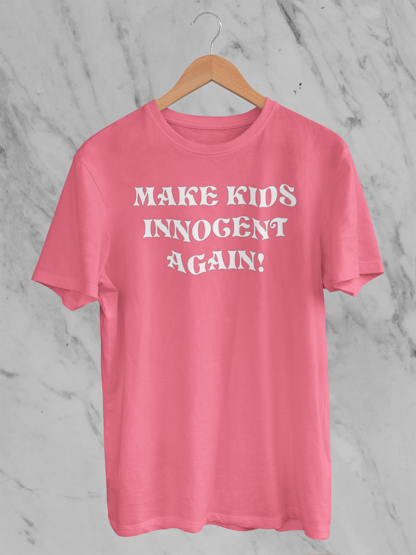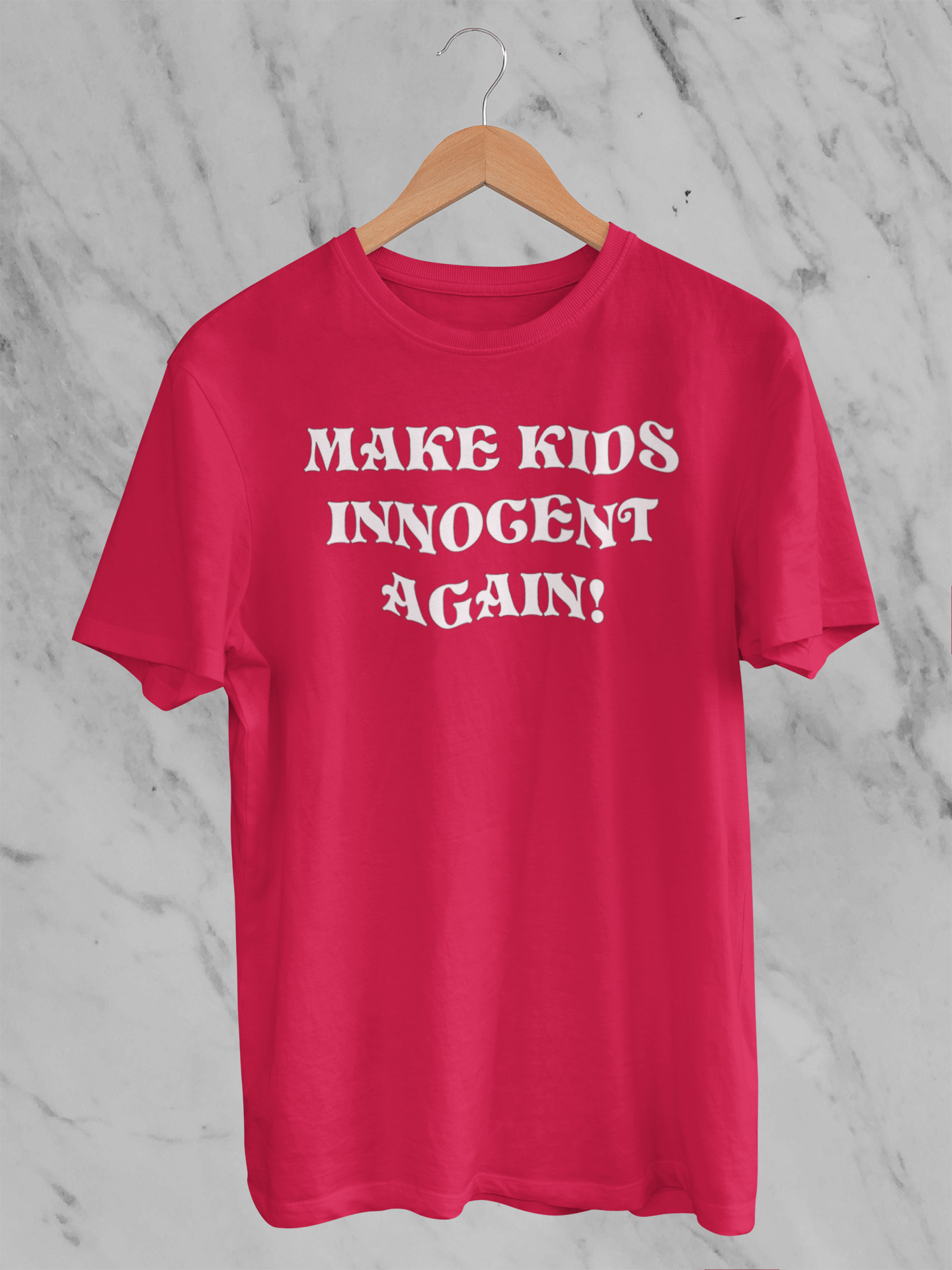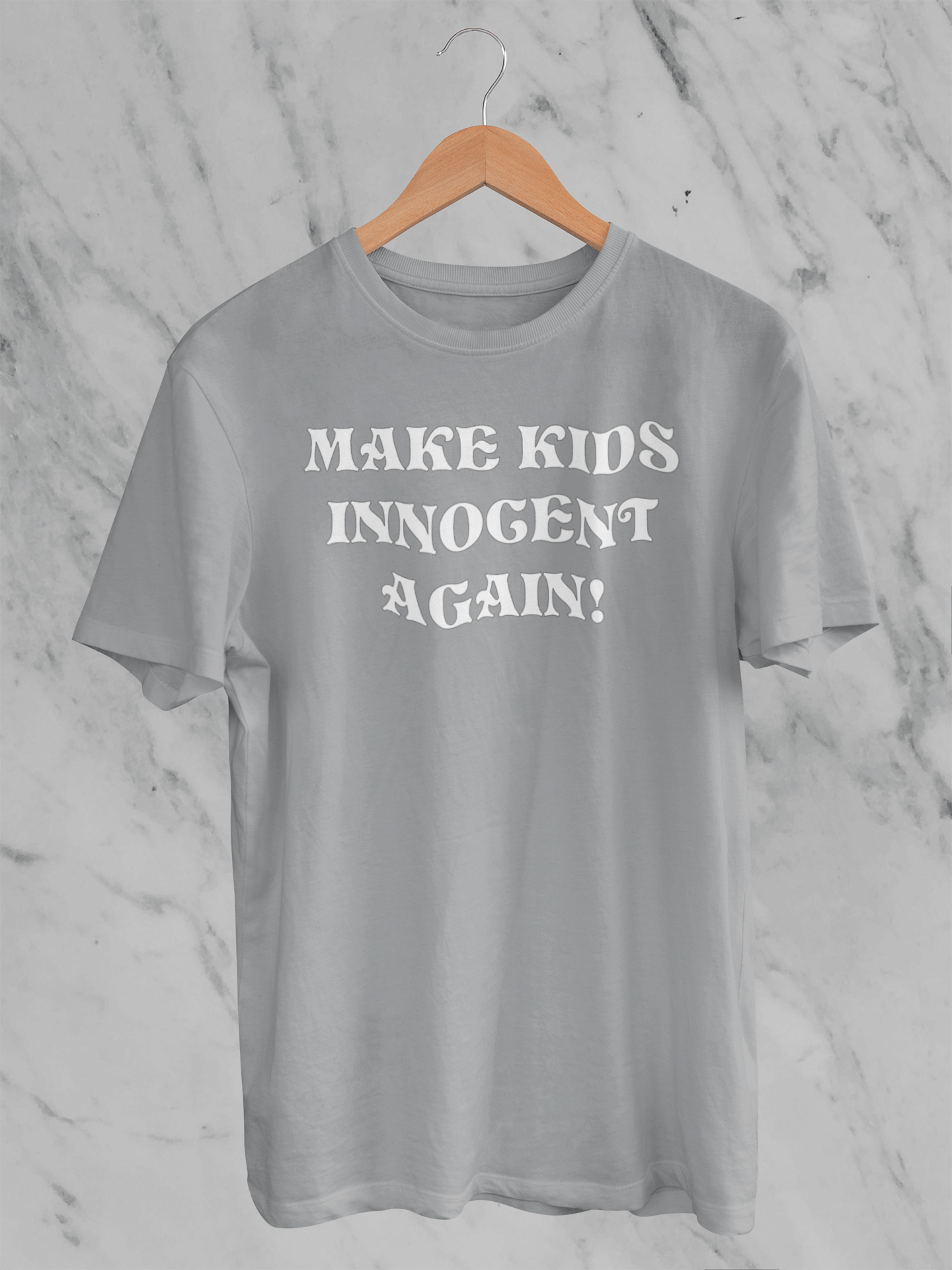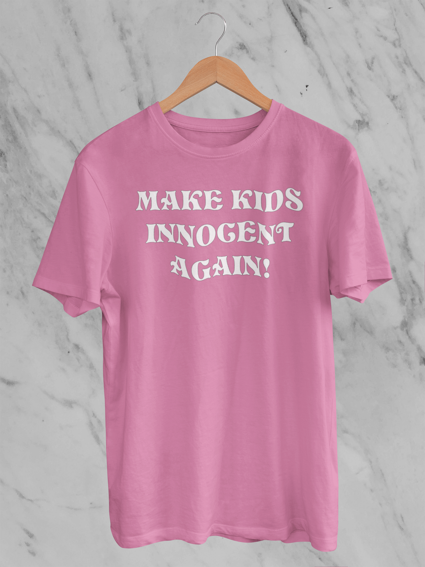 Unveiling a bold statement in a sea of messages, our "Make Kids Innocent Again" t-shirt is a resonant call to action. It's a playful yet poignant nod to a well-known political slogan, reimagined for today's concern over the premature end of childhood innocence.