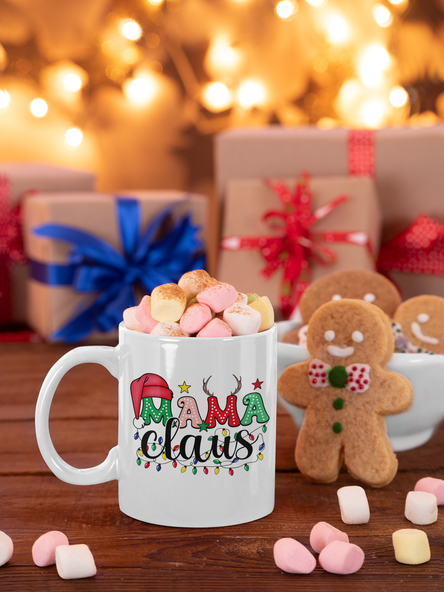 Celebrate the season in style with this charming "Mama Claus" ceramic mug, available in 12 oz and 15 oz sizes. Featuring festive polka-dot letters, holiday lights, and a Santa hat, this mug is perfect for the mom who lights up the holidays. Whether sipping coffee, tea, or cocoa, Mama Claus will feel the joy of the season with every drink. Grab yours today and make every moment a little more special!