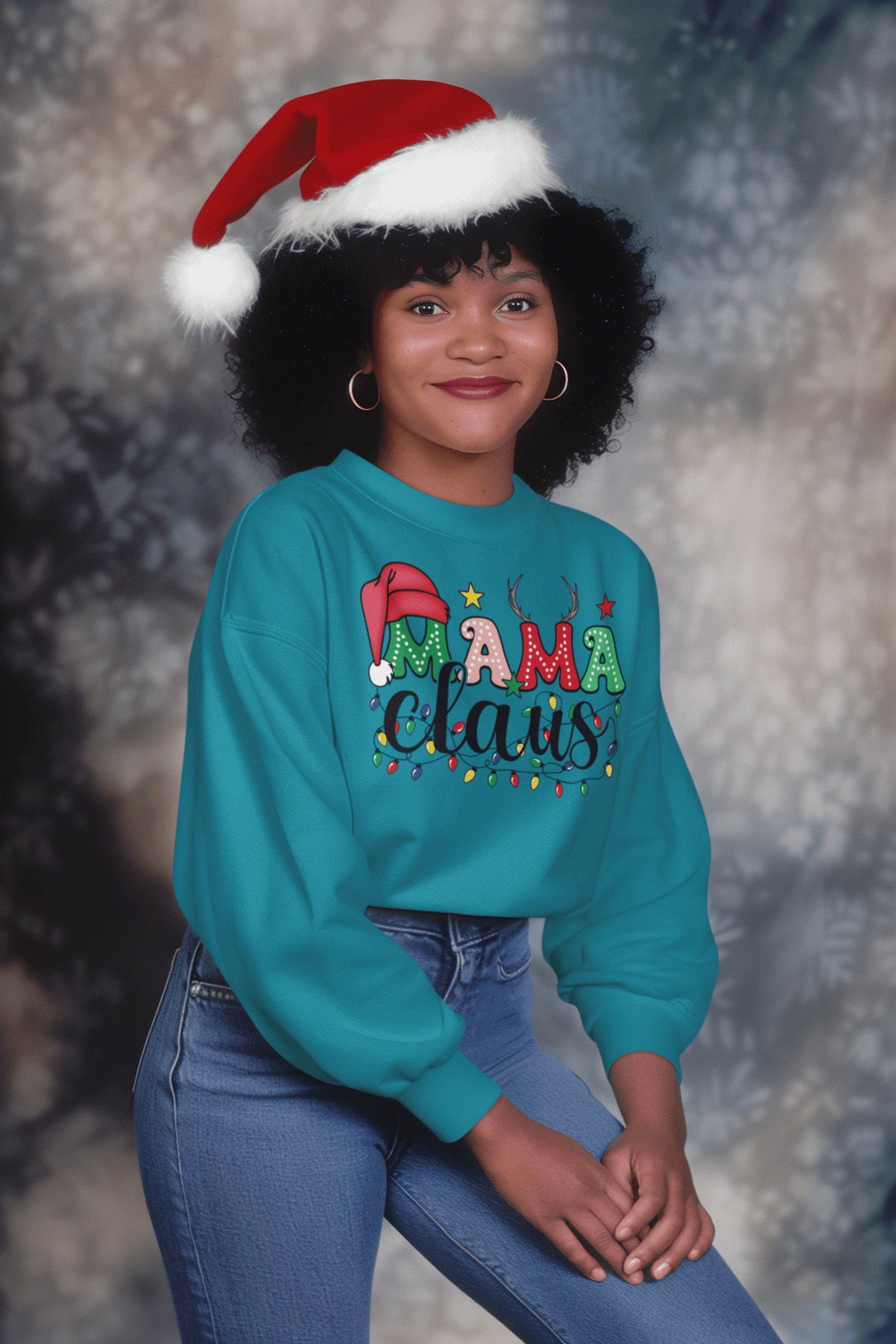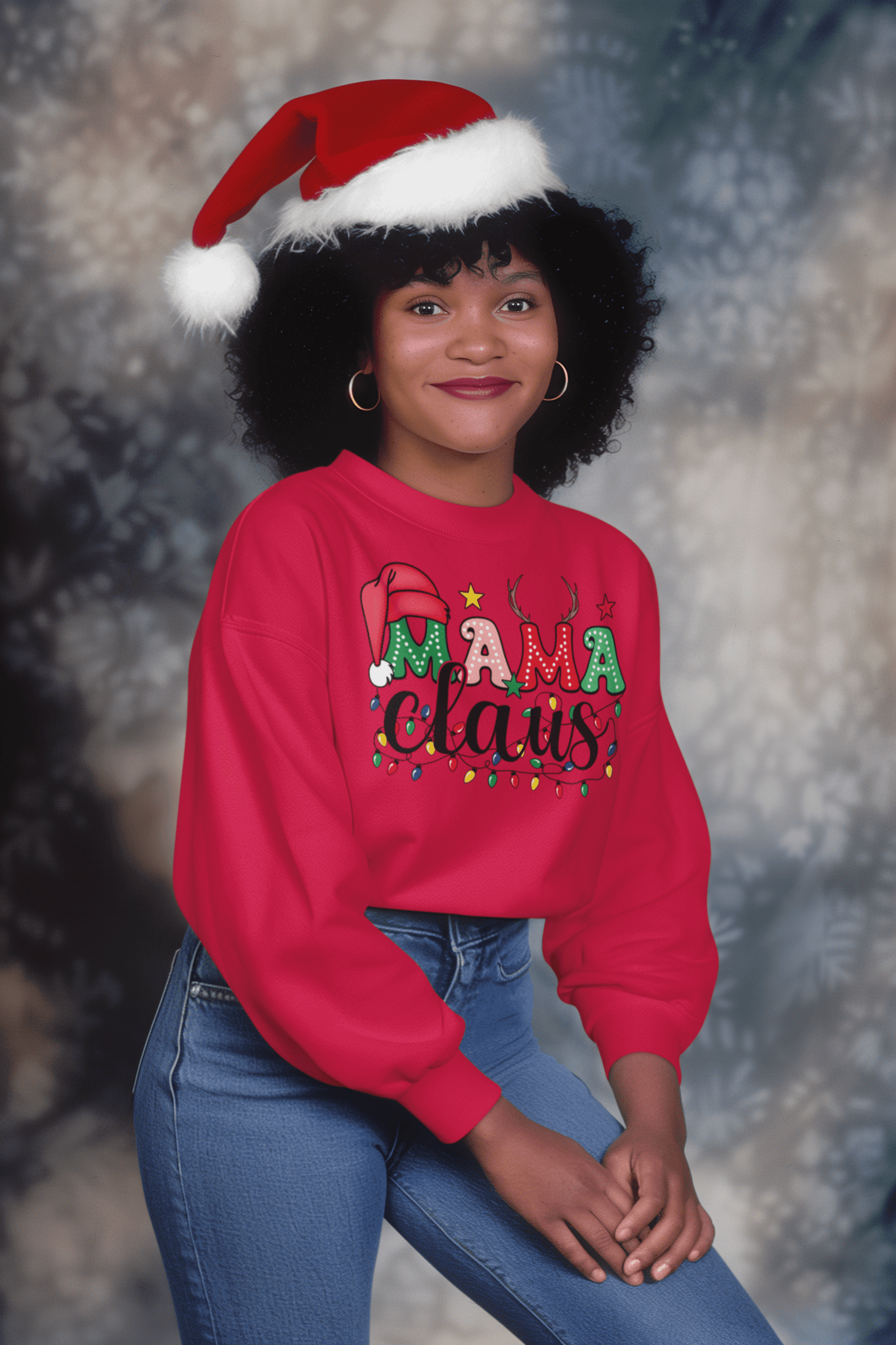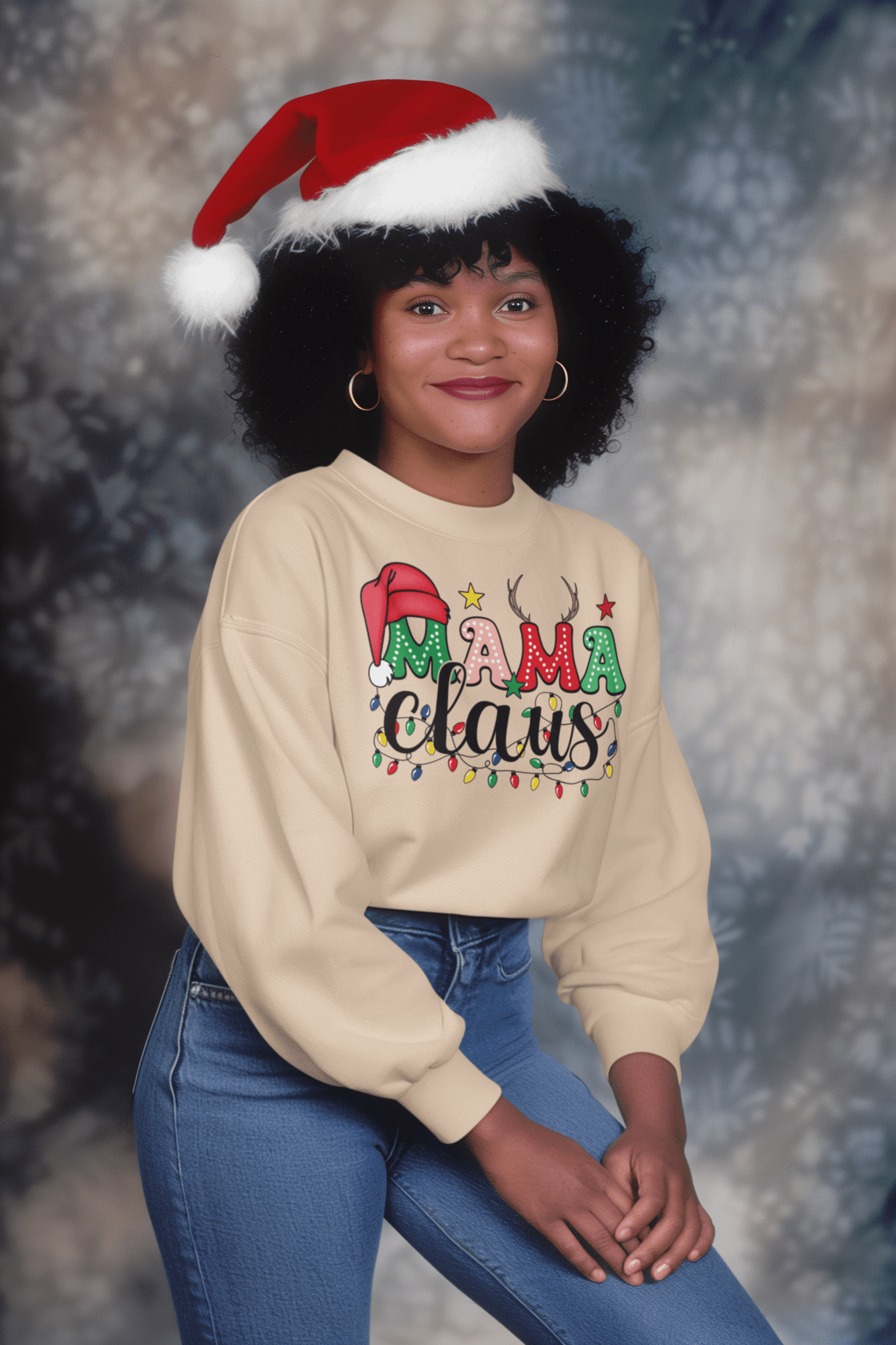 Celebrate the season in style with this festive "Mama" Christmas Sweatshirt! Featuring colorful, polka-dotted letters adorned with a Santa hat, reindeer antlers, and holiday stars, this design captures the fun and joy of being the heart of the holiday fun. Topped off with strings of vibrant Christmas lights, it’s perfect for the mom who does it all—wrapping, baking, decorating, and spreading cheer. Soft, comfy, and brimming with festive charm, this sweatshirt is a must-have for every Christmas-loving mama ready to shine this season!
