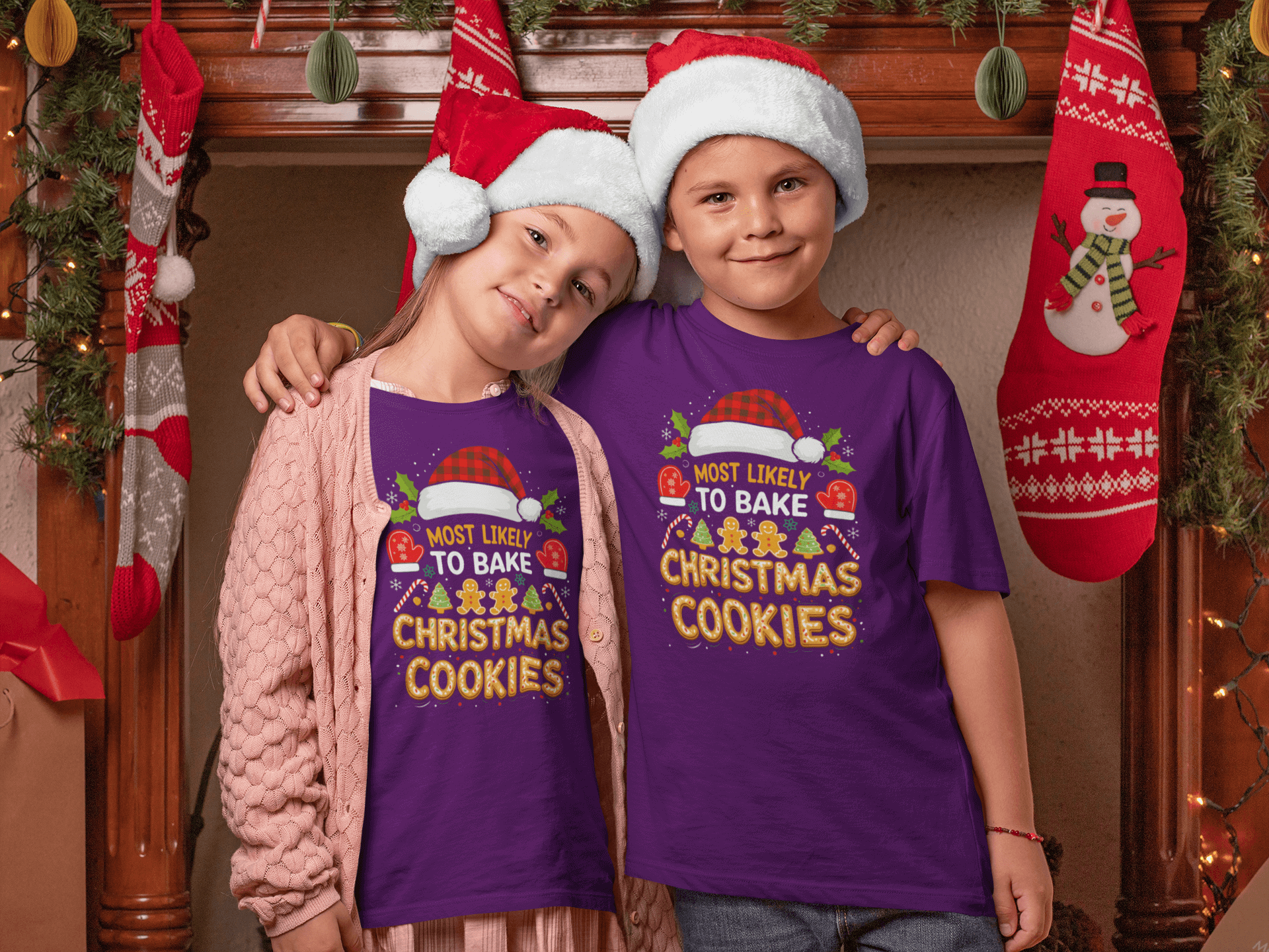 This "Most Likely to Bake Christmas Cookies" t-shirt is a must-have for holiday baking enthusiasts! Made with comfortable, high-quality fabric, it’s perfect for wearing while baking festive treats, attending holiday parties, or spreading Christmas cheer. The playful design features gingerbread cookies, candy canes, and a plaid Santa hat, making it an ideal gift for anyone who loves Christmas traditions and sweet treats.! Also in Unisex Adult sizes.