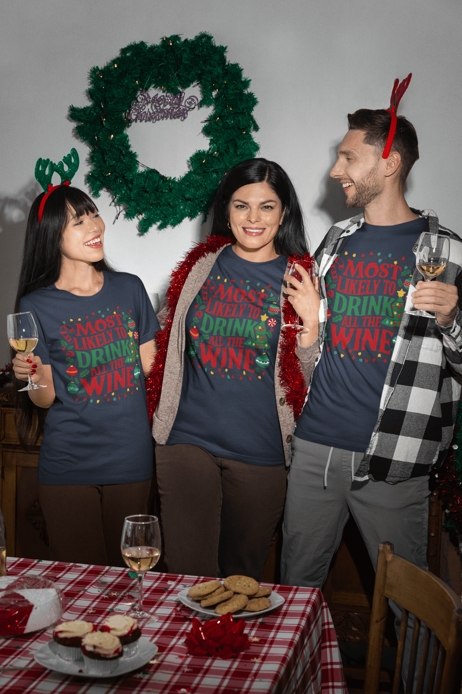 Cheers to holiday spirit(s) with our 'Most Likely to Drink All the Wine' T-shirt! Perfect for the wine lover in your life—or the one who’s always refilling their glass at Christmas dinner—this festive design features bold red and green lettering surrounded by holly, ornaments, candy canes, and twinkling holiday lights. Whether you're hosting or toasting, this shirt is guaranteed to bring a smile (and maybe a pour) to any celebration. Get yours today and sip in style this holiday season!