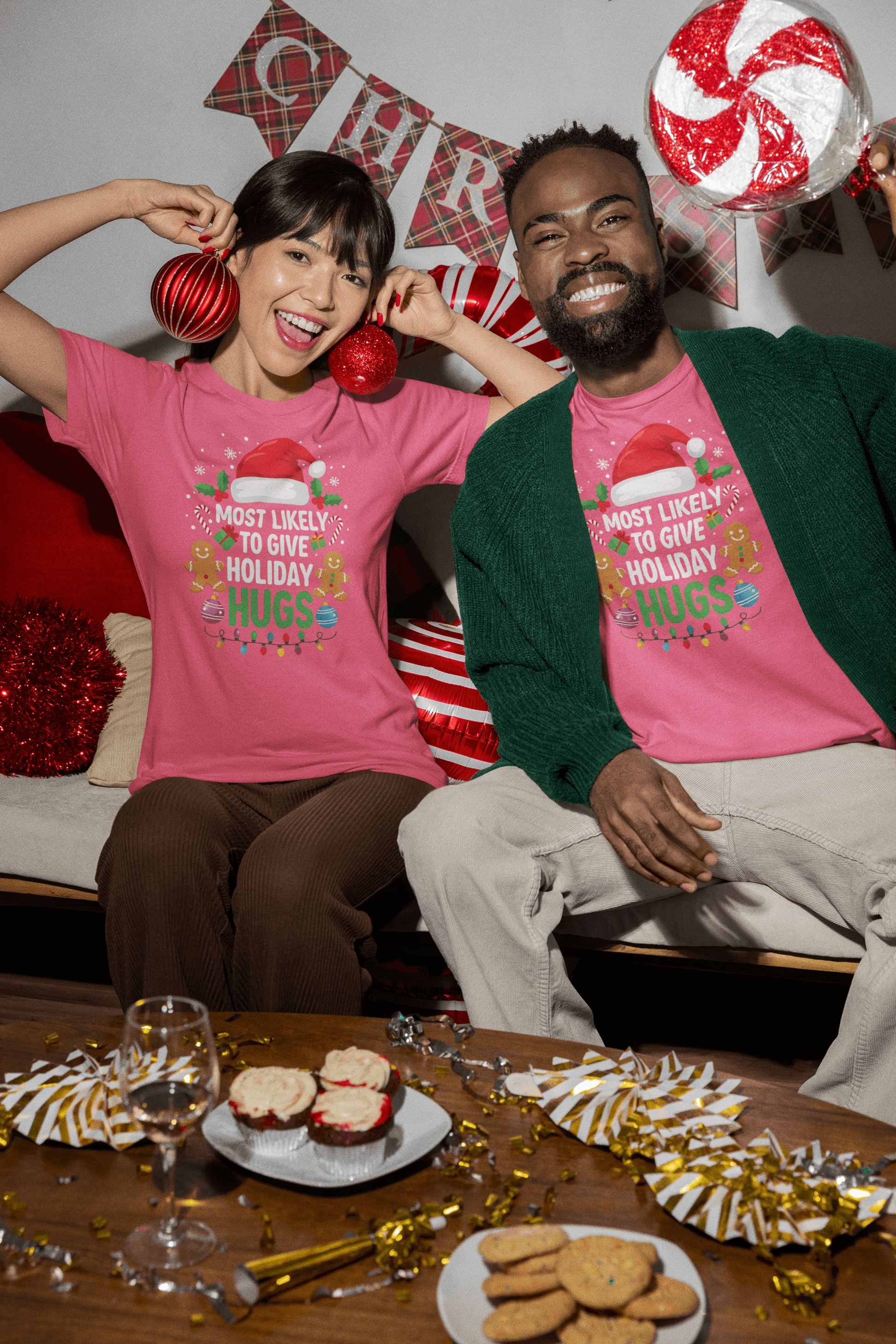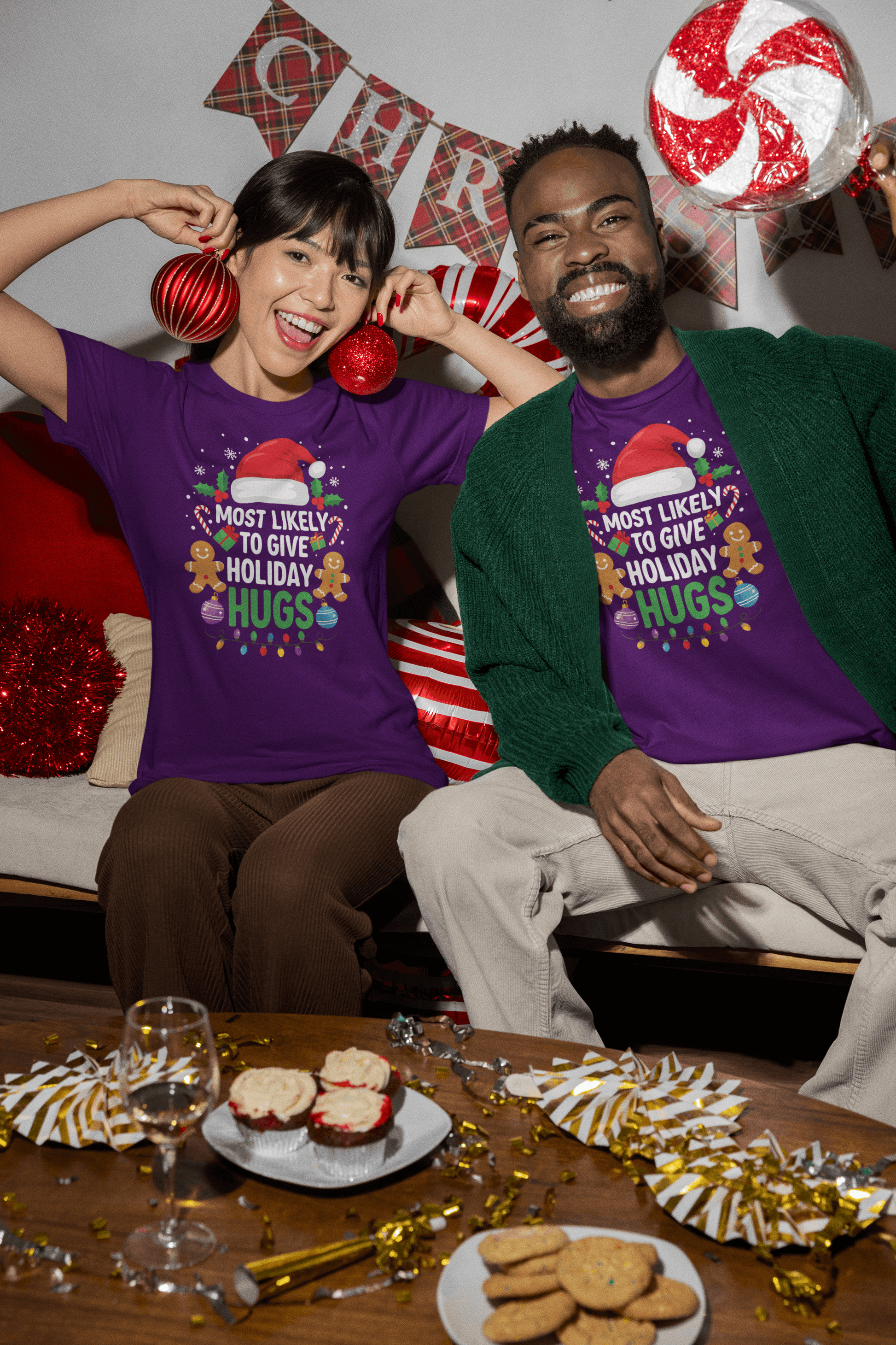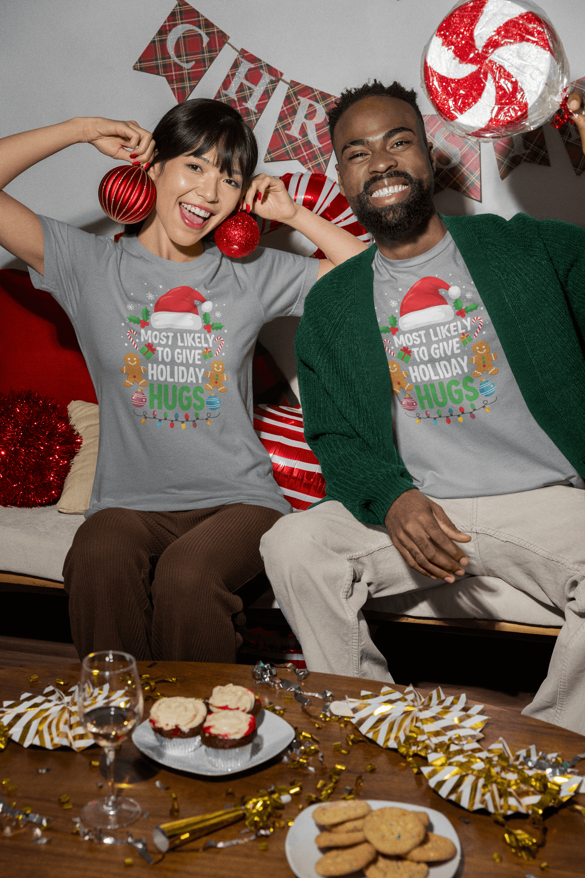 Wrap the season in love with our 'Most Likely to Give Holiday Hugs' T-shirt! Featuring a jolly Santa hat, gingerbread cookies, candy canes, and colorful holiday lights, this design is perfect for spreading warmth and cheer. Whether you're the family hugger or just love bringing smiles, this shirt is your go-to for festive gatherings. Share the joy of the season—grab yours today and give the gift of holiday hugs! Also available in youth sizes.Â