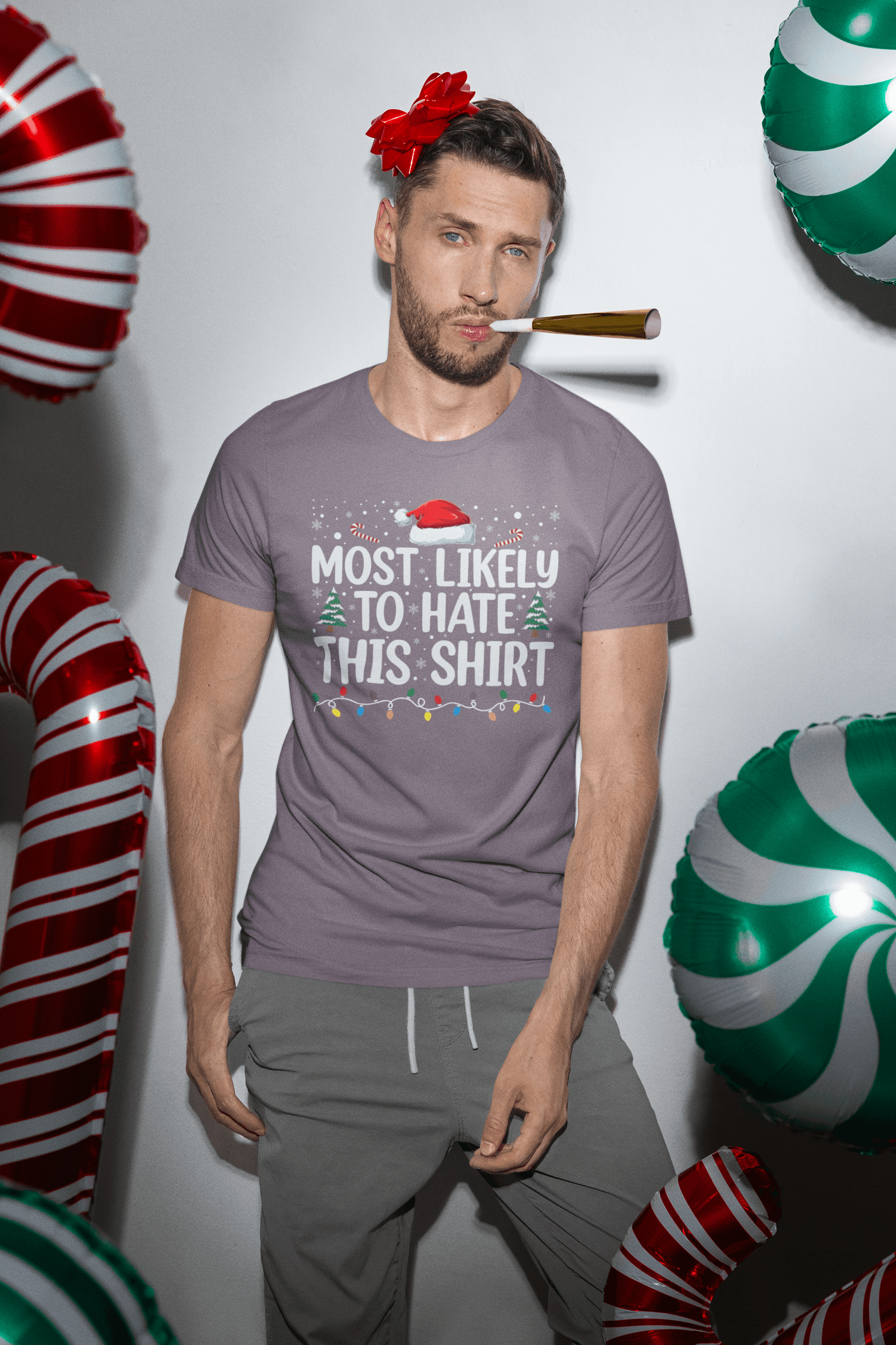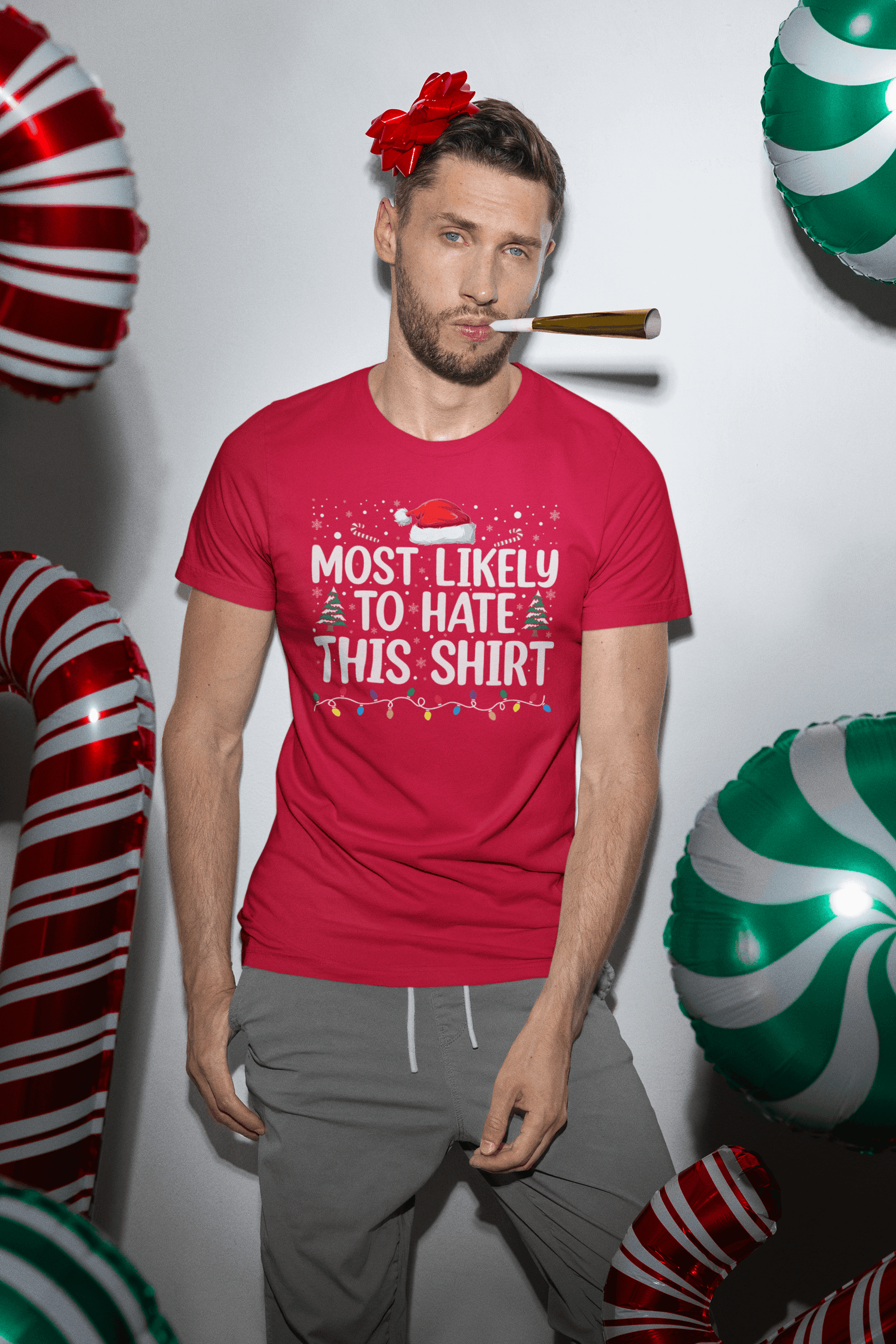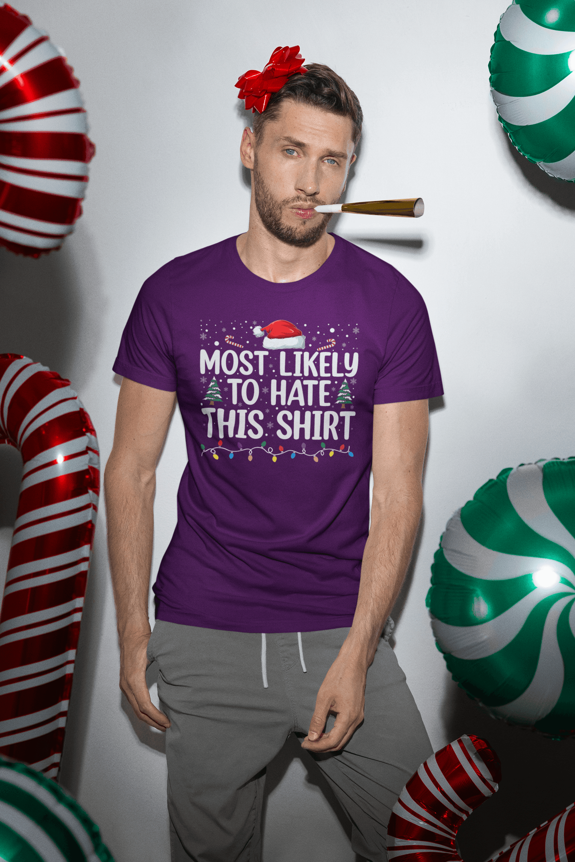 Embrace the irony with our 'Most Likely to Hate This Shirt' T-shirt! Perfect for the holiday grump or the person who can’t resist a good laugh, this cheeky design features festive candy canes, snowflakes, string lights, and a Santa hat for the ultimate mix of sass and seasonal cheer. Whether you’re gifting it to a reluctant wearer or claiming it for your own sarcastic self, this shirt guarantees a smile—even if it’s through a holiday grumble. Grab yours now and spread some humor this season!. Also available in youth sizes.