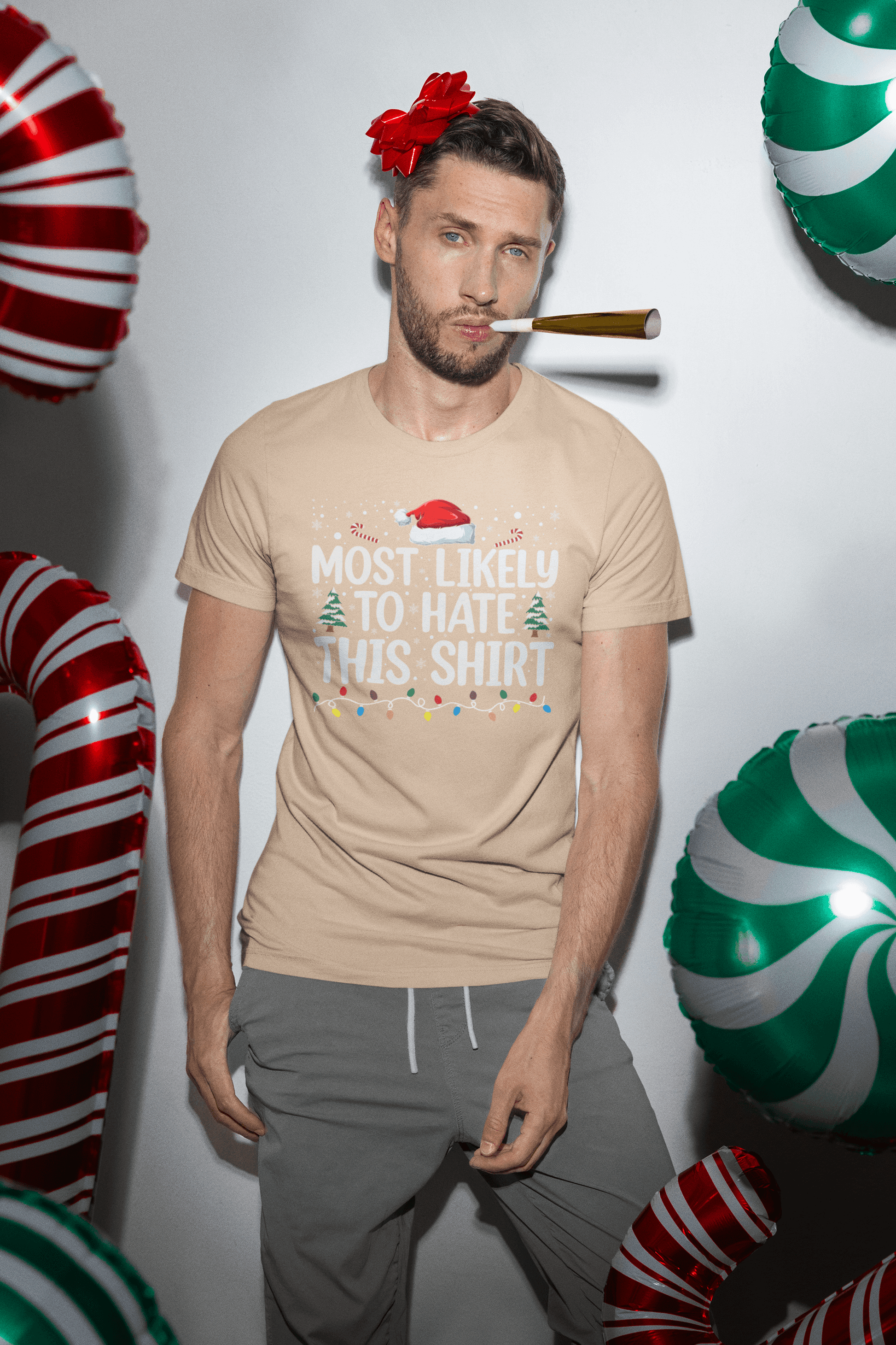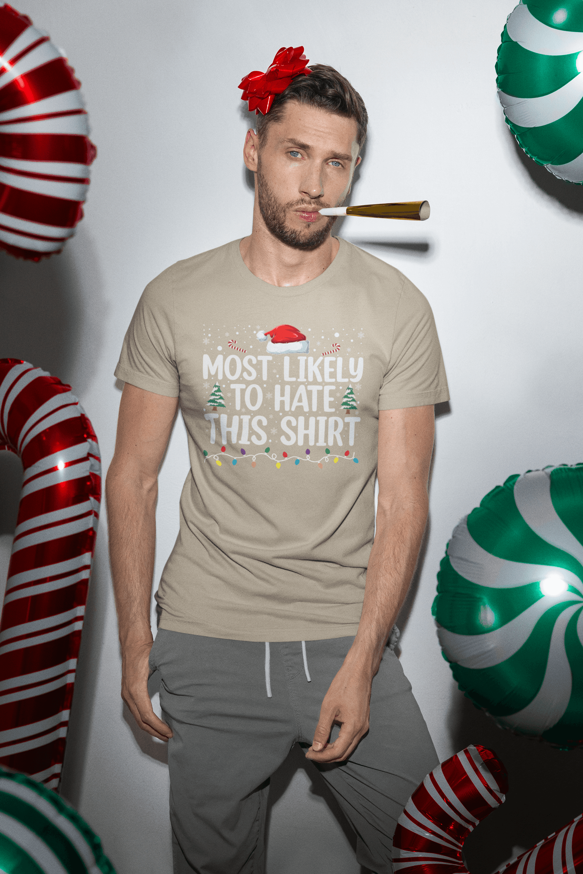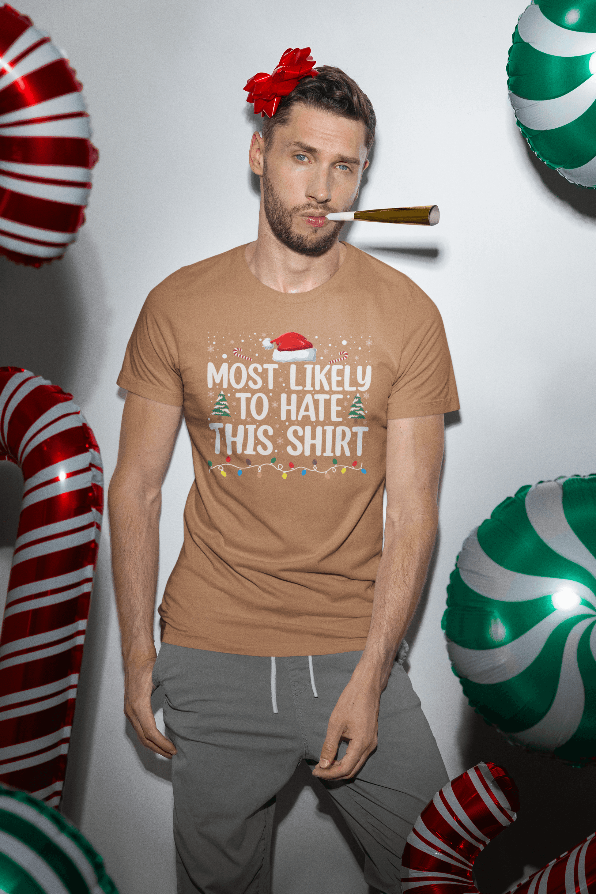 Embrace the irony with our 'Most Likely to Hate This Shirt' T-shirt! Perfect for the holiday grump or the person who can’t resist a good laugh, this cheeky design features festive candy canes, snowflakes, string lights, and a Santa hat for the ultimate mix of sass and seasonal cheer. Whether you’re gifting it to a reluctant wearer or claiming it for your own sarcastic self, this shirt guarantees a smile—even if it’s through a holiday grumble. Grab yours now and spread some humor this season!. Also available in youth sizes.