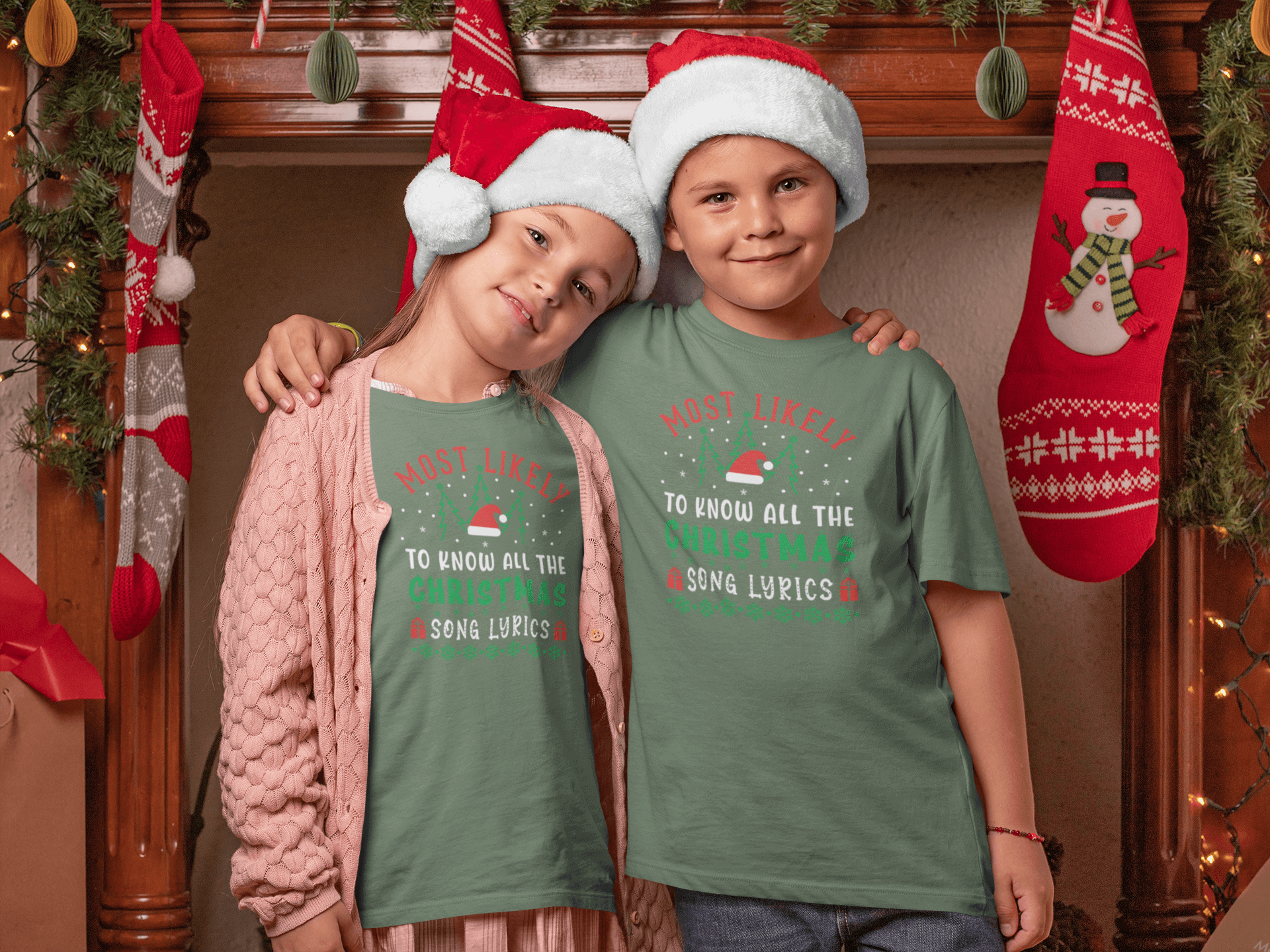 Celebrate the season in style with our 'Most Likely to Know the Christmas Song Lyrics' T-shirt! This simple yet festive design features cheerful Christmas trees, snowflakes, gift boxes, and a classic Santa hat in bright red and green, perfect for spreading holiday cheer. Whether you're cozying up for family gatherings or out and about enjoying the holiday spirit, this shirt is your go-to for a merry and bright look. Get yours now and make every moment feel like Christmas! Also in Unisex Adult sizes.
