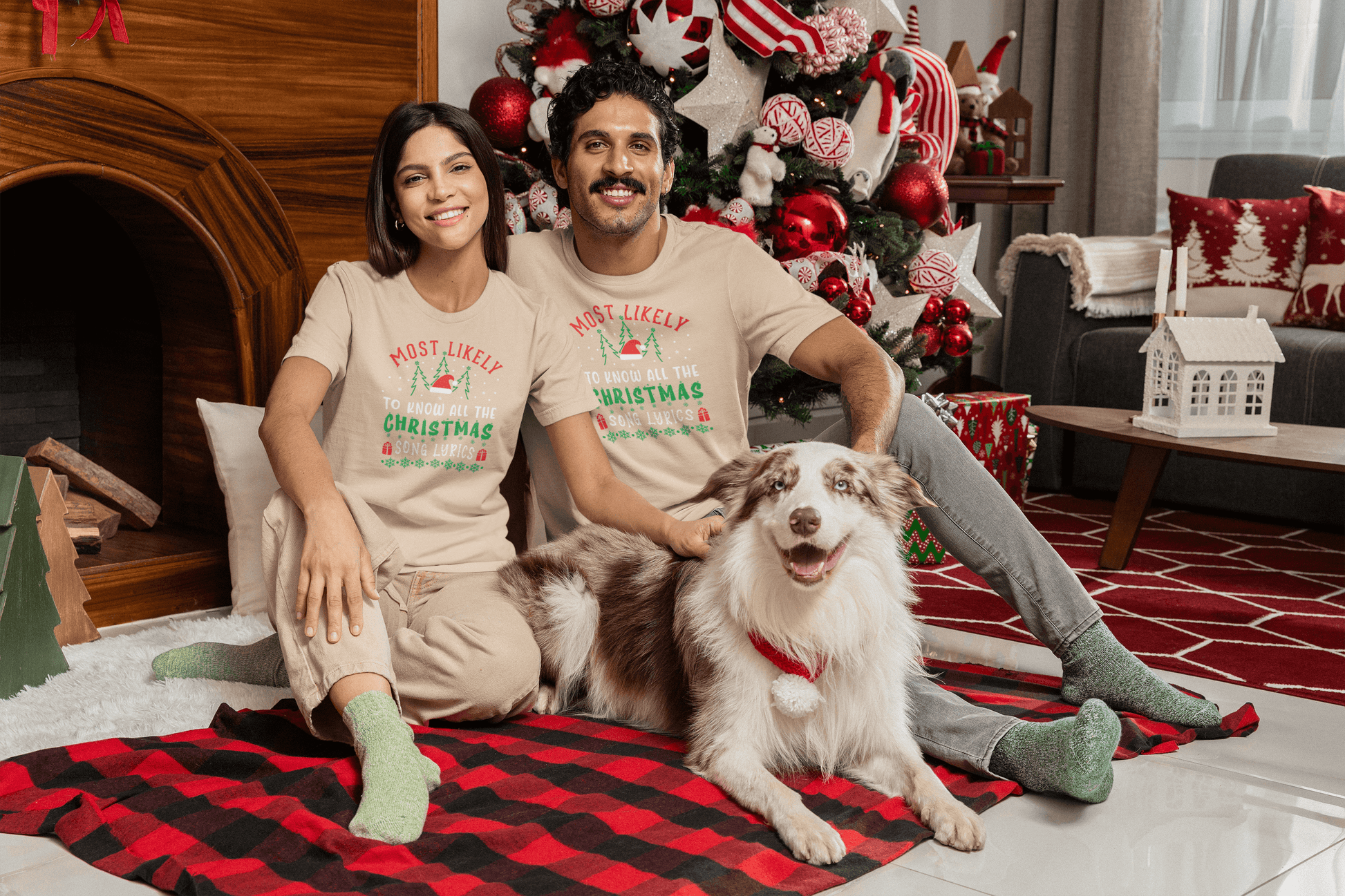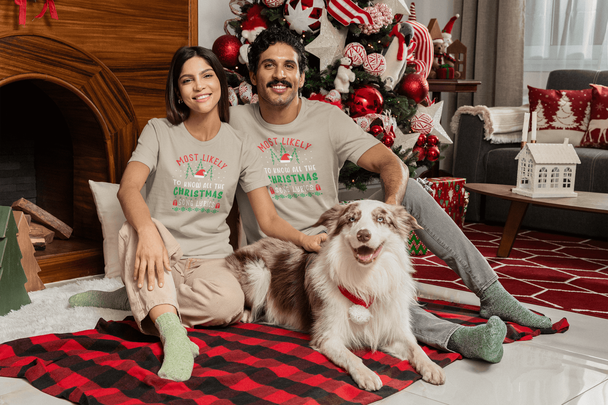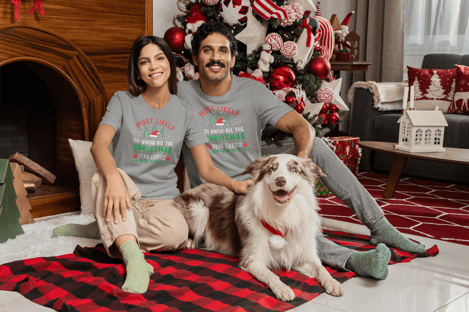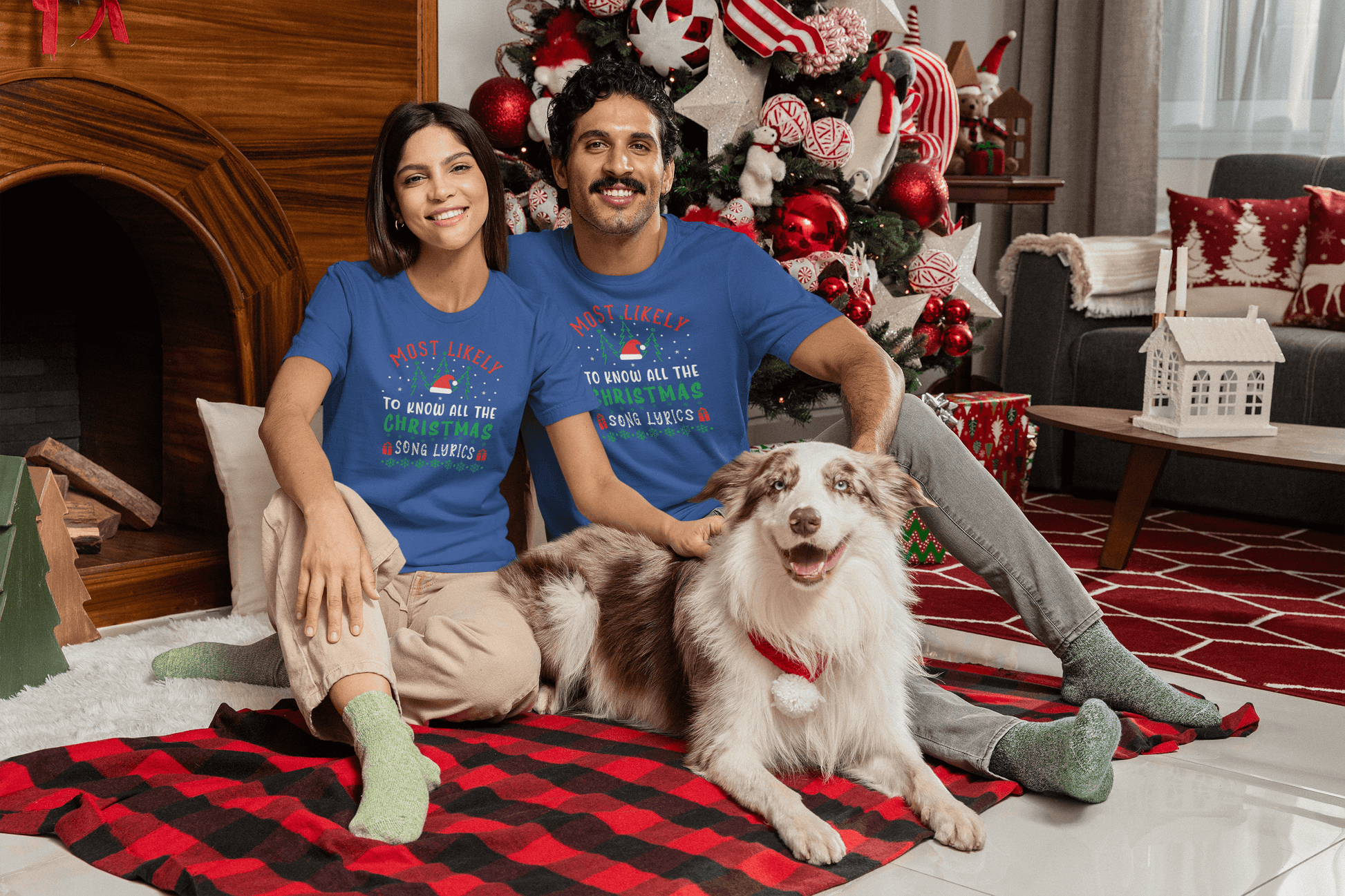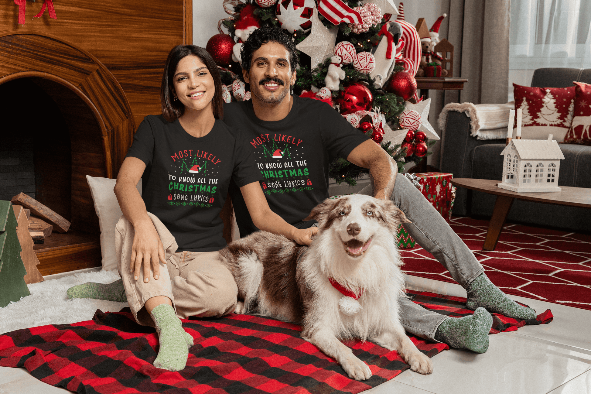 Celebrate the season in style with our 'Most Likely to Know the Christmas Song Lyrics' T-shirt! This simple yet festive design features cheerful Christmas trees, snowflakes, gift boxes, and a classic Santa hat in bright red and green, perfect for spreading holiday cheer. Whether you're cozying up for family gatherings or out and about enjoying the holiday spirit, this shirt is your go-to for a merry and bright look. Get yours now and make every moment feel like Christmas! Also available in youth sizes.Â