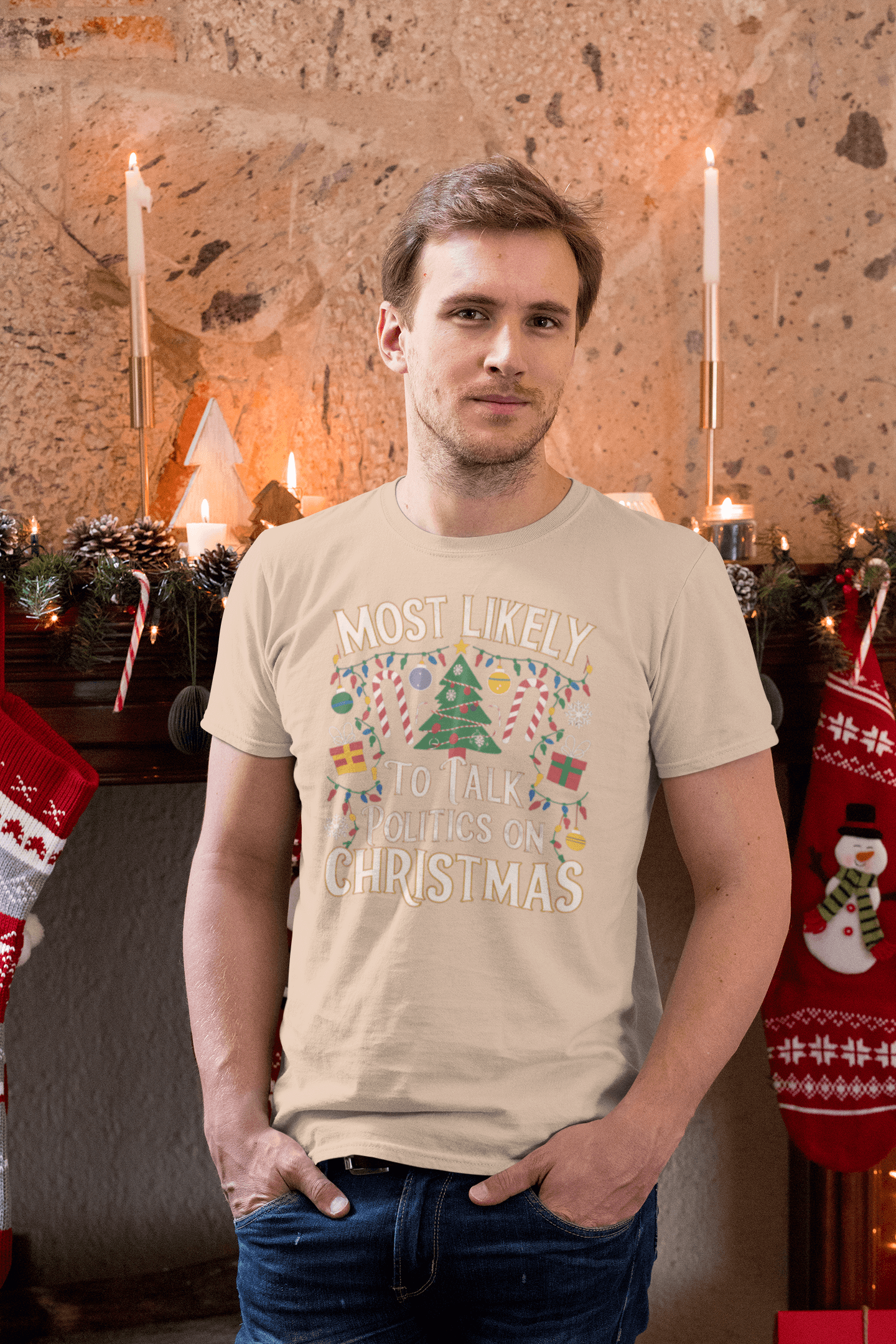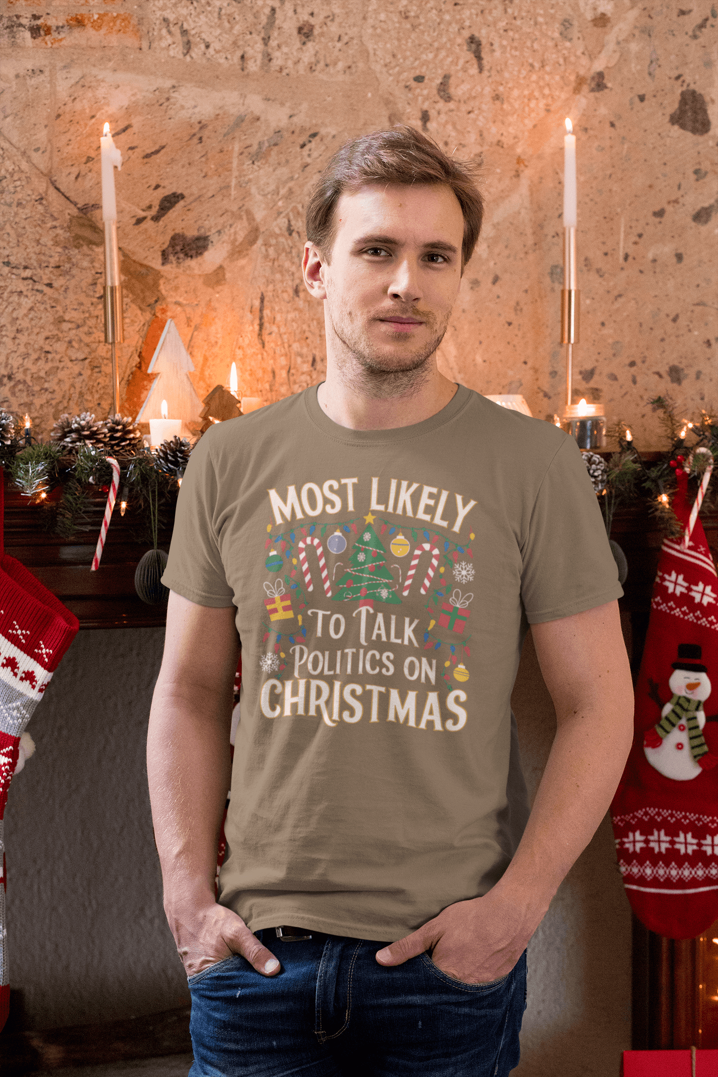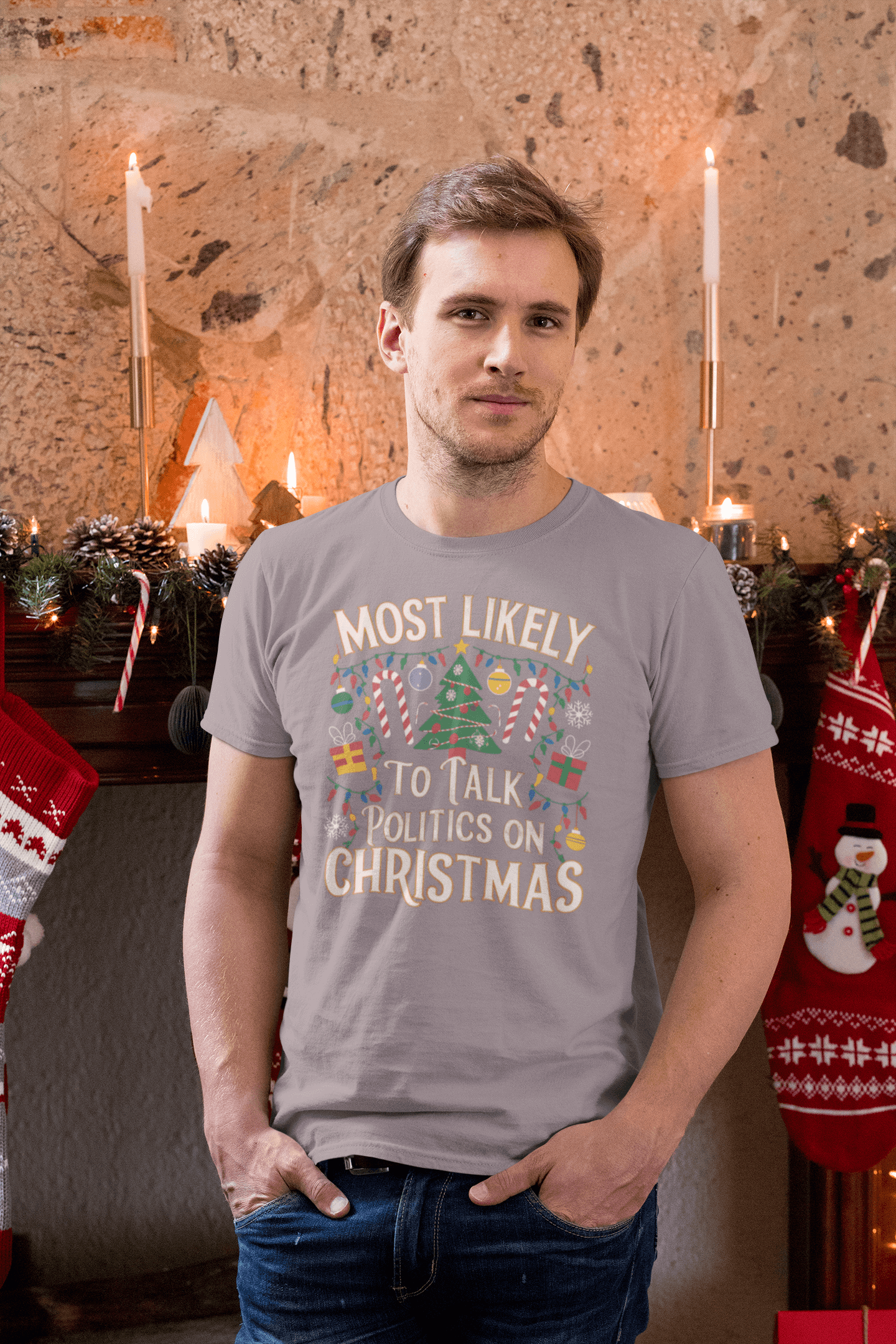 Spice up your holiday gatherings with our 'Most Likely to Talk Politics on Christmas' T-shirt! Perfect for the family member who’s always ready to stir the pot—or the one who likes to keep everyone laughing. Featuring festive holiday icons like candy canes, ornaments, and a Christmas tree, this design blends holiday cheer with a dash of playful truth. Whether you’re gifting it to a friend or wearing it to make a bold entrance, this shirt is sure to be a conversation starter. Grab yours today and keep the holiday discussions lively!