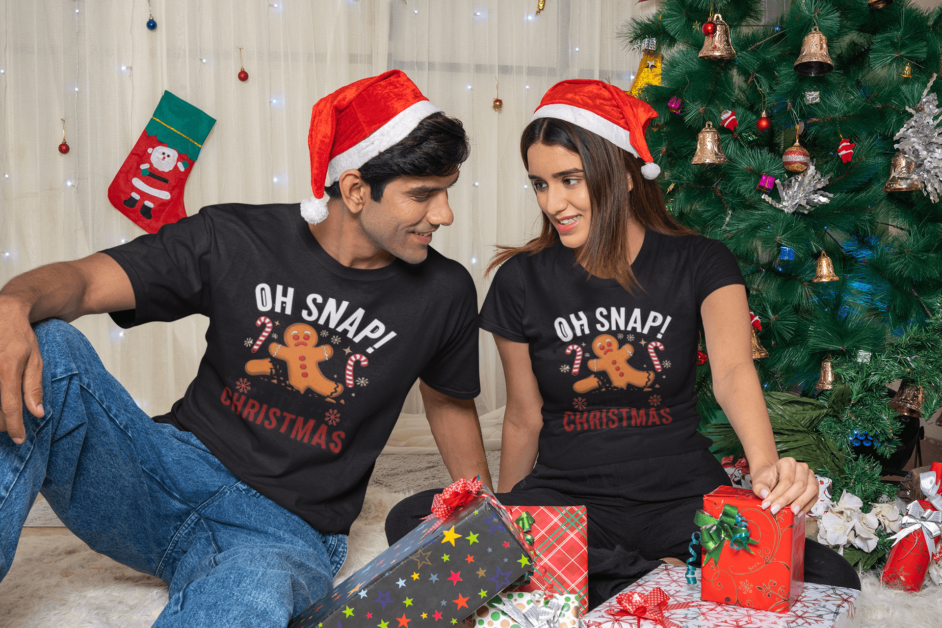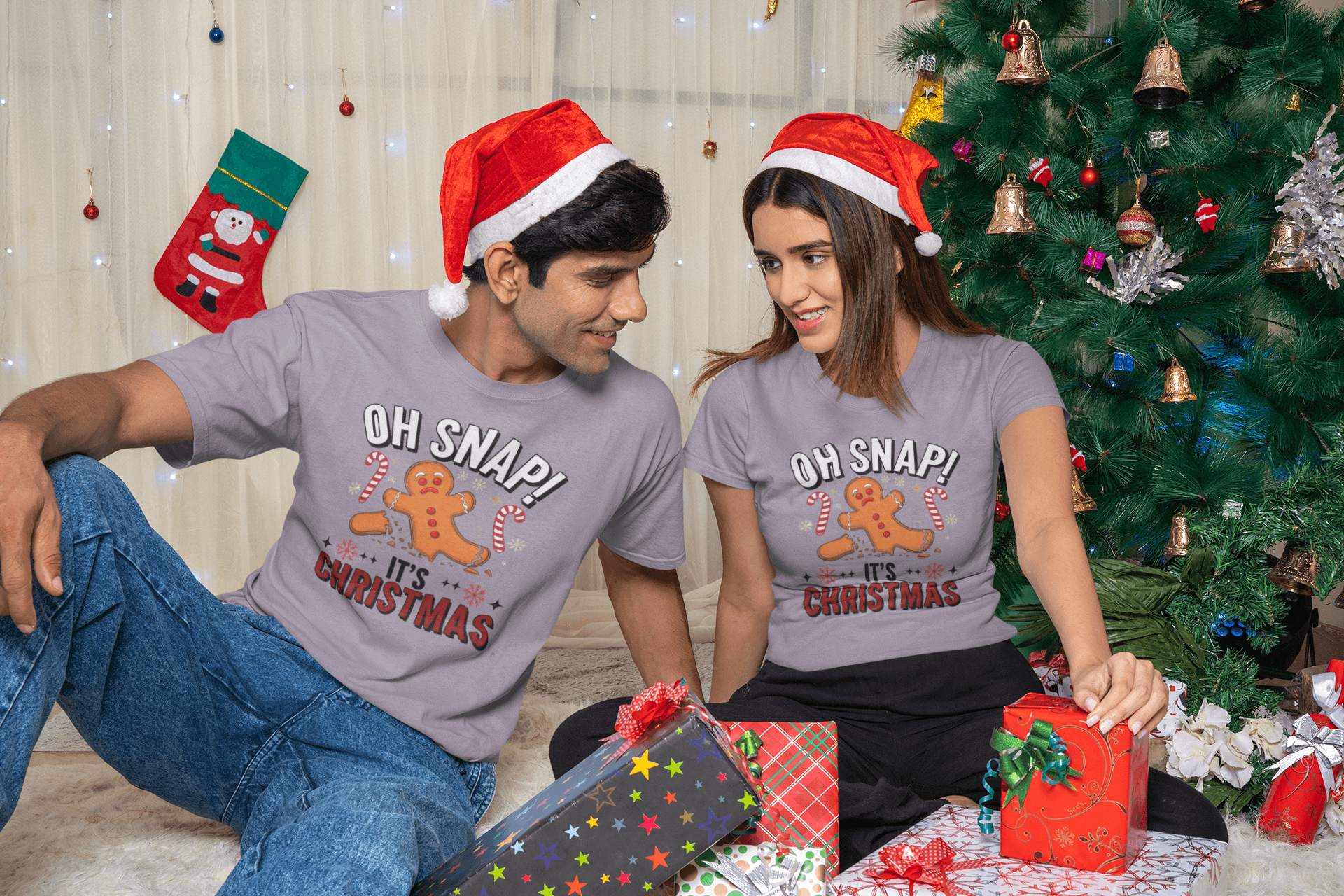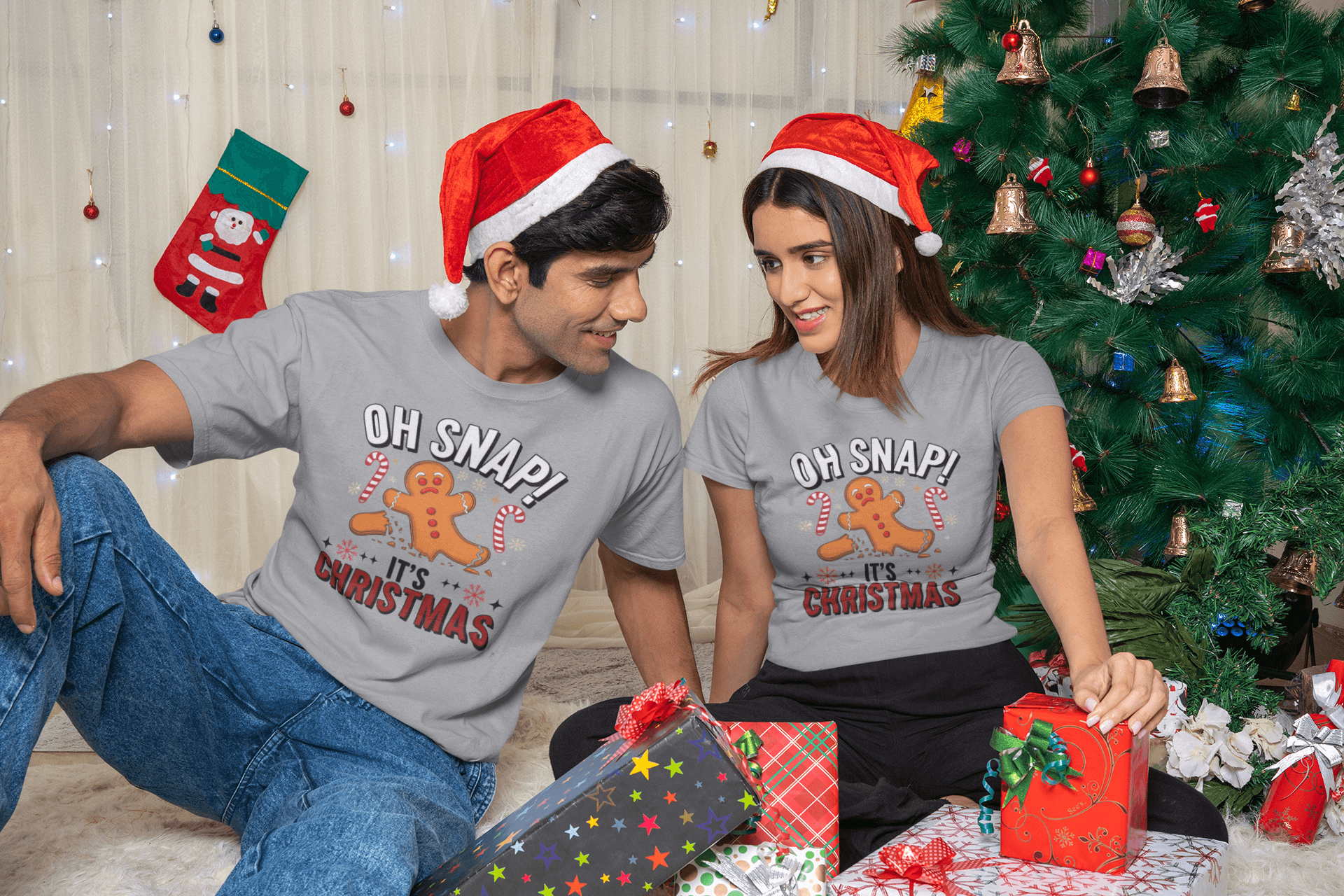 Add some humor to the holidays with our "Oh Snap! Christmas" t-shirt featuring a hilariously panicked gingerbread man. Perfect for Christmas morning, parties, or wrapping presents in style, this tee combines festive fun with cozy comfort. Available in sizes for everyone, it's a great way to share the laughs this season. Don’t wait—snap one up today and make your holidays extra sweet!