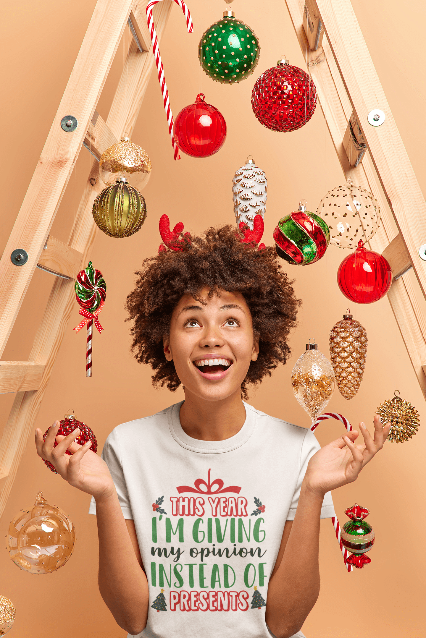 This design delivers a dose of humor and holiday spirit! Featuring bold, festive typography accented with Christmas elements like holly, trees, and a gift bow, it playfully declares, "This year, I'm giving my opinion instead of presents." Perfect for those who like to keep it real during the holidays, this shirt is great for gatherings where honesty is the best gift of all.