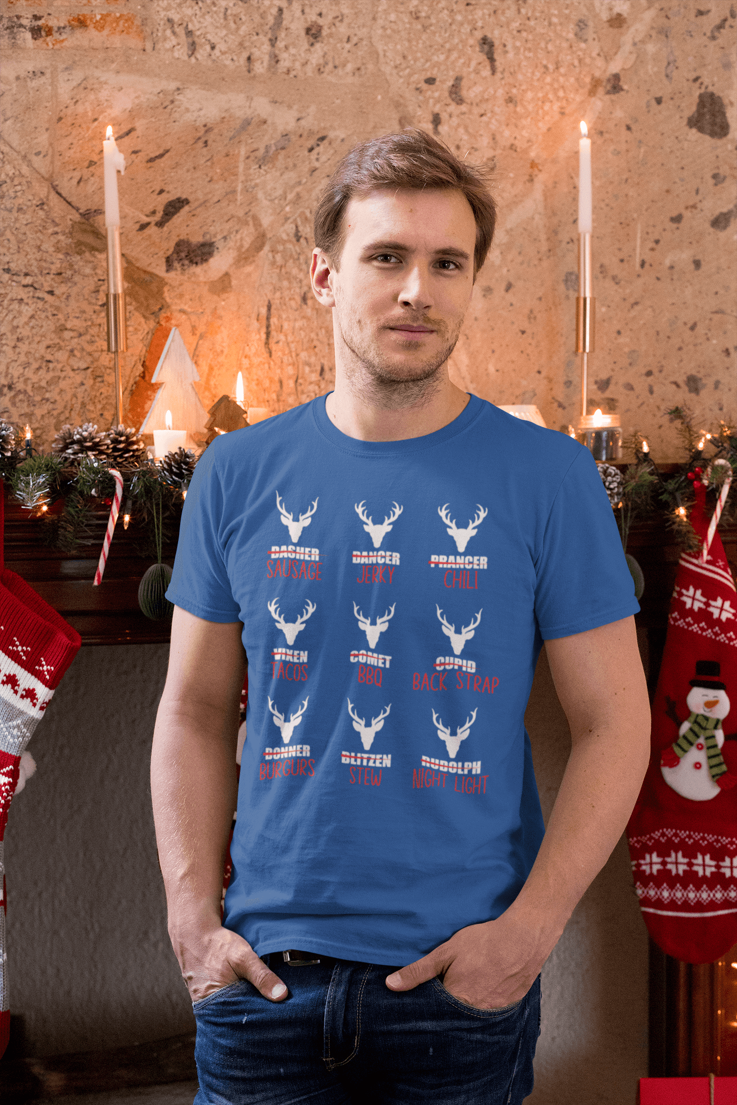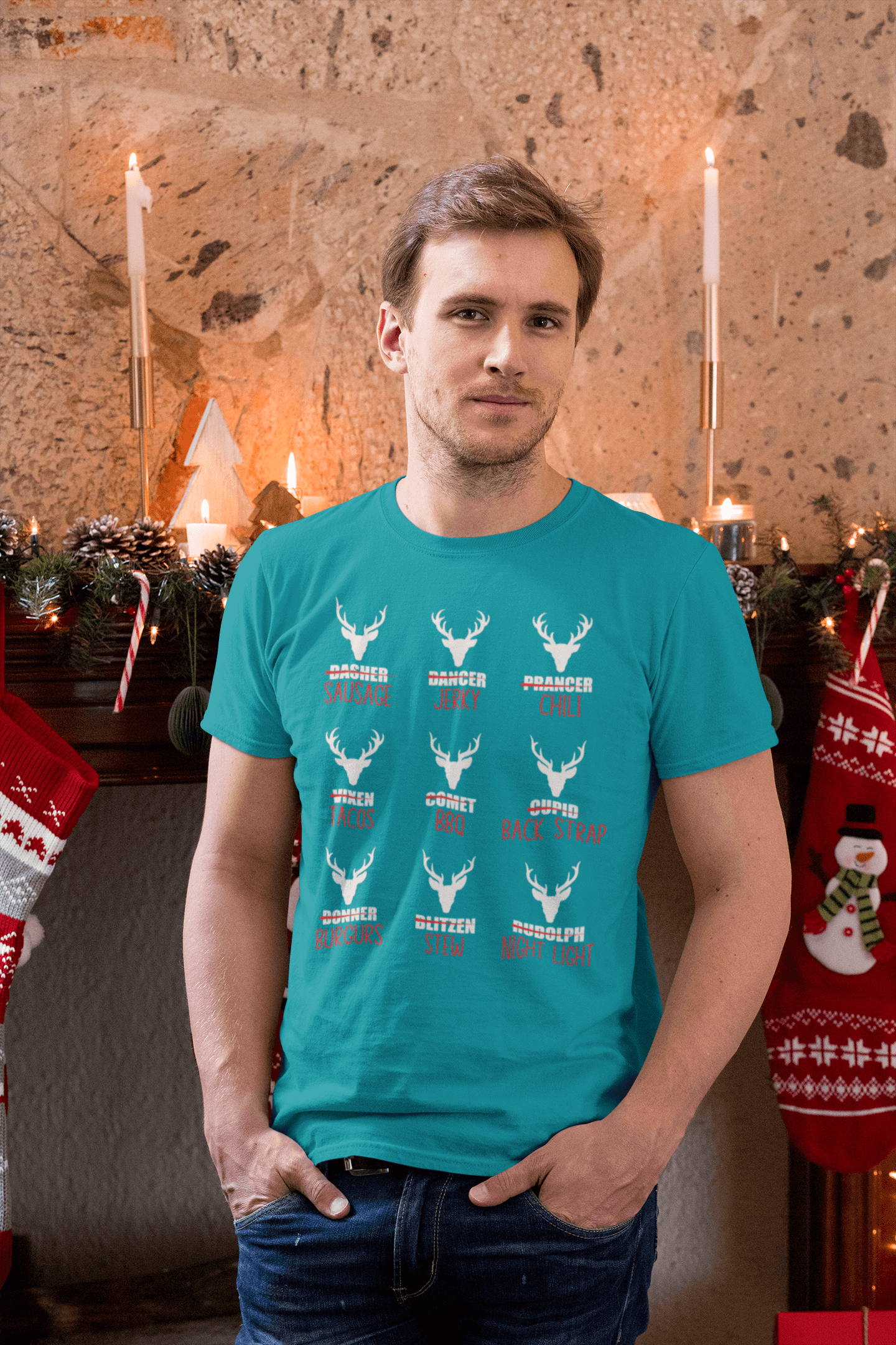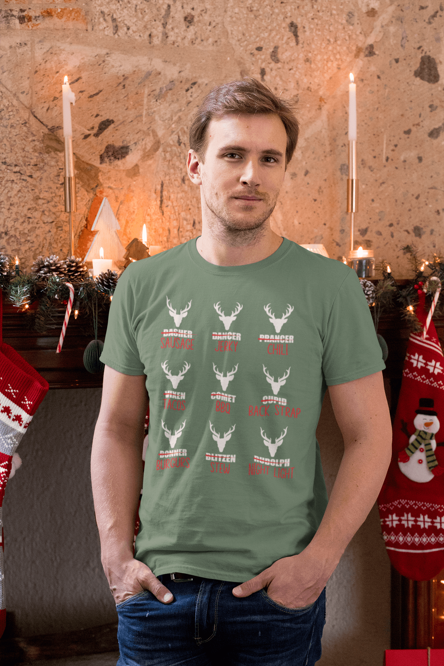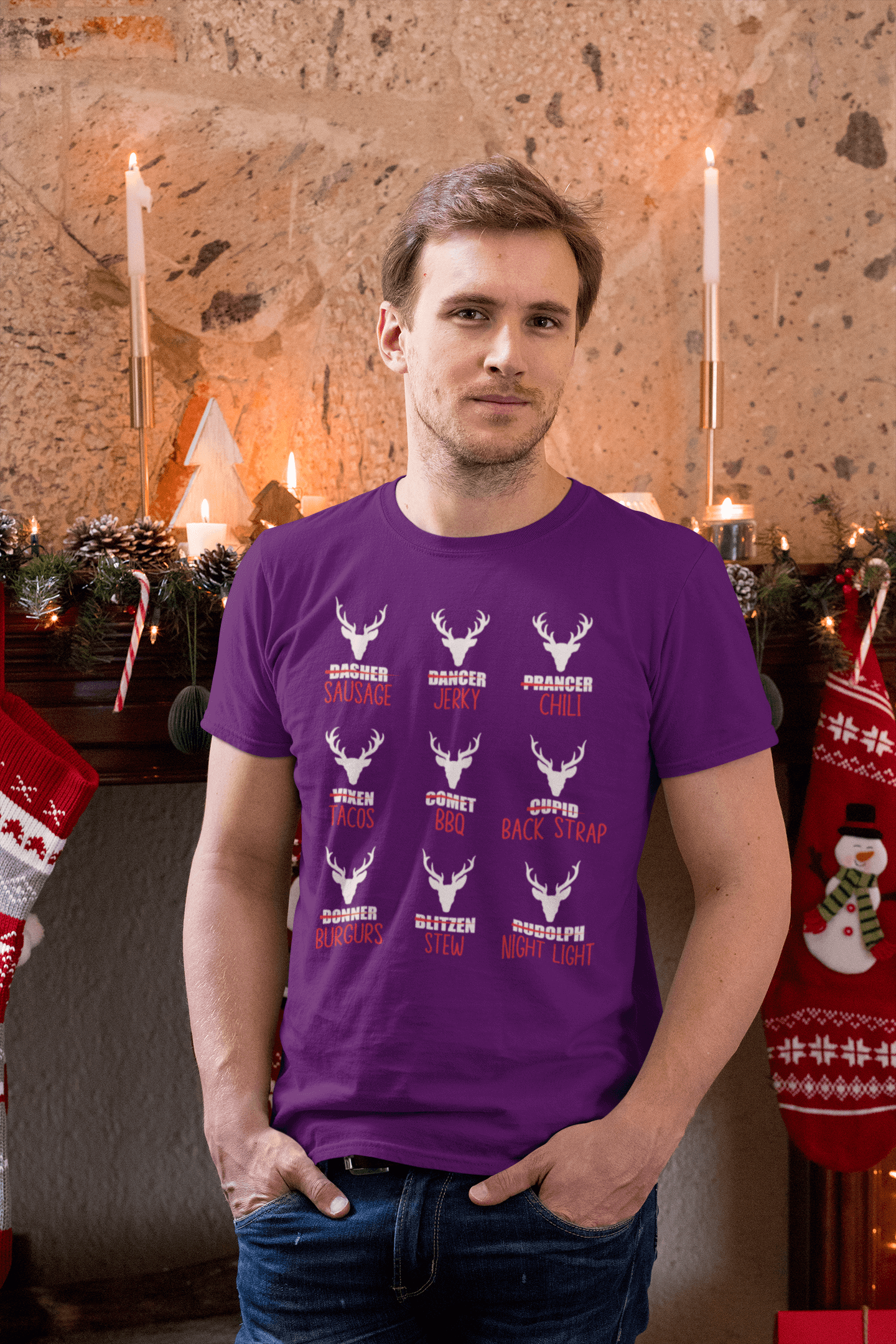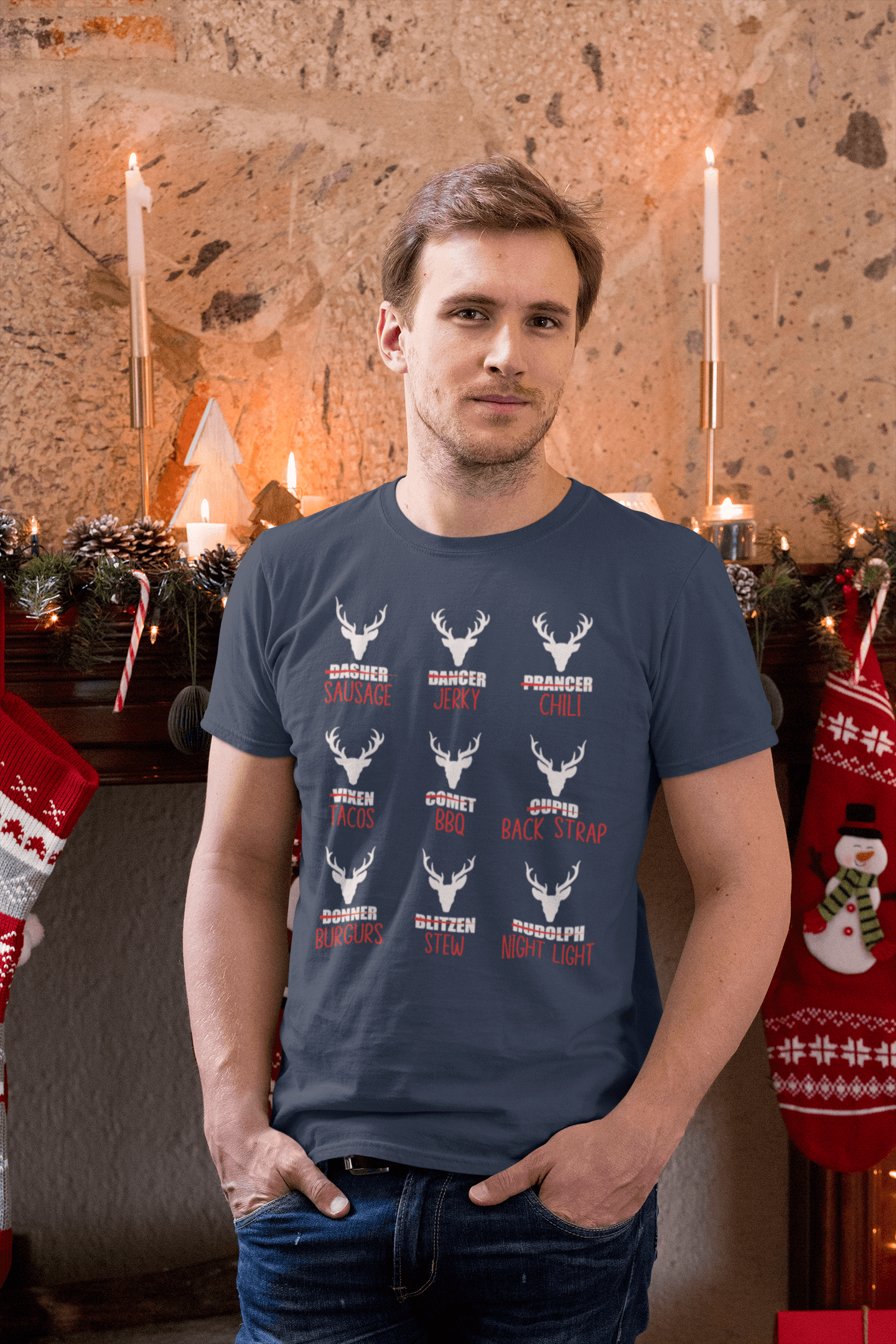 Get a laugh out of every hunter and holiday enthusiast with our 'Reindeer Menu' T-shirt! Featuring a cheeky twist on Santa's iconic crew, this design humorously lists 'menu options' for each reindeer, from sausage and jerky to stew and BBQ, paired with festive antlers and bold text. Perfect for the outdoorsy humorist or the life of the holiday gathering, this shirt is sure to spark conversation and plenty of chuckles. Grab yours today and bring a hearty dose of holiday humor to your wardrobe!