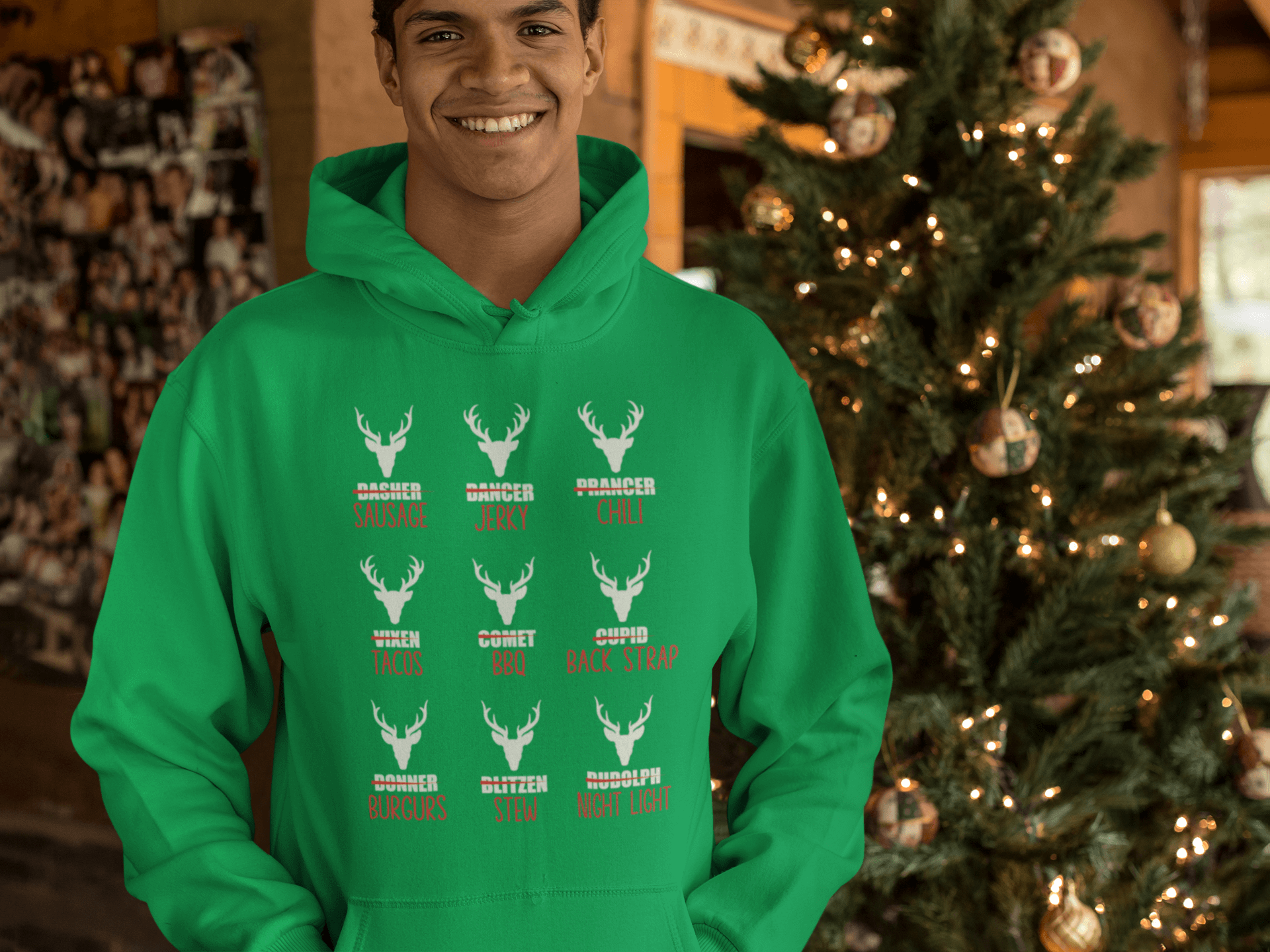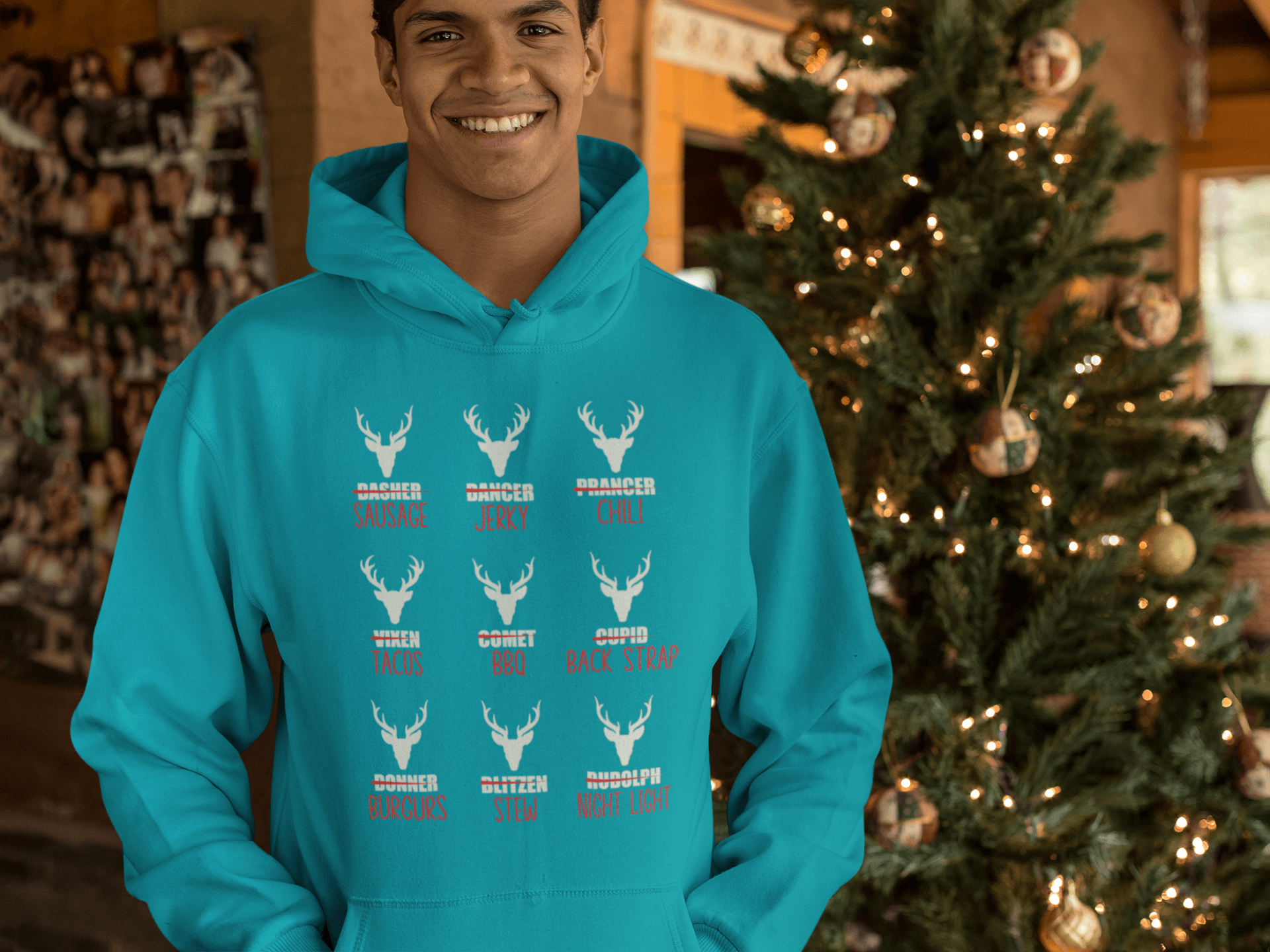 Get a laugh out of every hunter and holiday enthusiast with our 'Reindeer Menu' Hoodie! Featuring a cheeky twist on Santa's iconic crew, this design humorously lists 'menu options' for each reindeer, from sausage and jerky to stew and BBQ, paired with festive antlers and bold text. Perfect for the outdoorsy humorist or the life of the holiday gathering, this hoodie is sure to spark conversation and plenty of chuckles. Grab yours today and bring a hearty dose of holiday humor to your wardrobe!