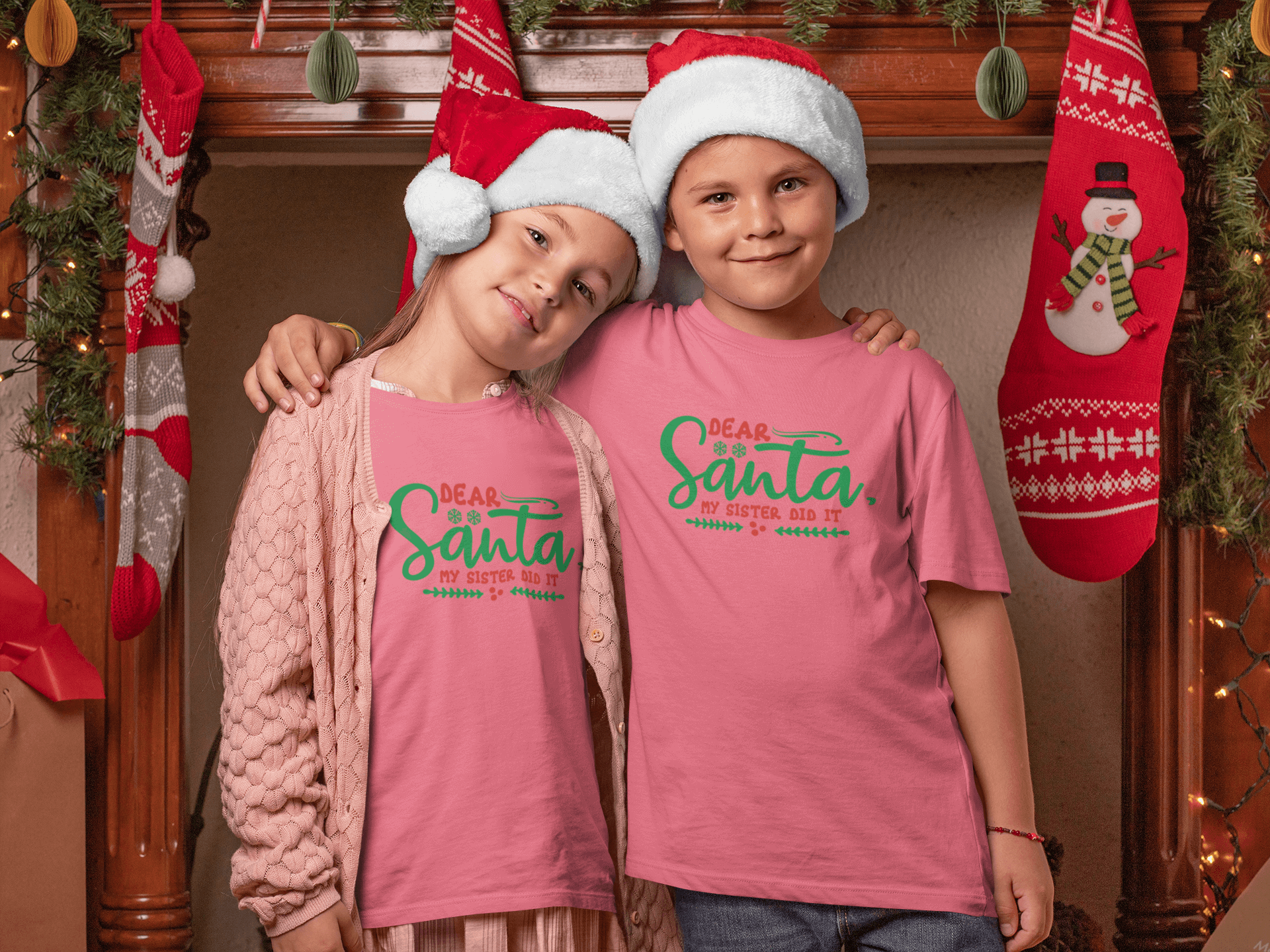 Add some sibling humor to the holidays with this cheeky "Dear Santa, My Sister Did It!" T-shirt! Featuring festive red and green lettering with fun holiday accents like snowflakes and holly, this design is perfect for kids who know the art of playful blame. Whether it’s for family gatherings, holiday parties, or just spreading laughter and joy, this shirt is a fun way to show off some sibling rivalry in the spirit of Christmas. Comfortable, colorful, and full of personality, it’s a great addition to any little troublemaker’s holiday wardrobe!