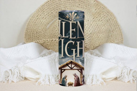 This beautiful depiction of the Nativity scene captures the quiet reverence of Christmas night with the text "Silent Night" in a bold, elegant font, set against a deep, starry blue backdrop. Below, the humble manger scene is lovingly illustrated, showing Mary, Joseph, shepherds, and other figures gathered in prayerful adoration around the infant Jesus, who radiates a warm light. The use of muted tones and watercolor textures creates a soft, peaceful ambiance, perfectly embodying the tranquility and holiness of the moment. The celestial stars and gentle glow emphasize the divine nature of this cherished scene.