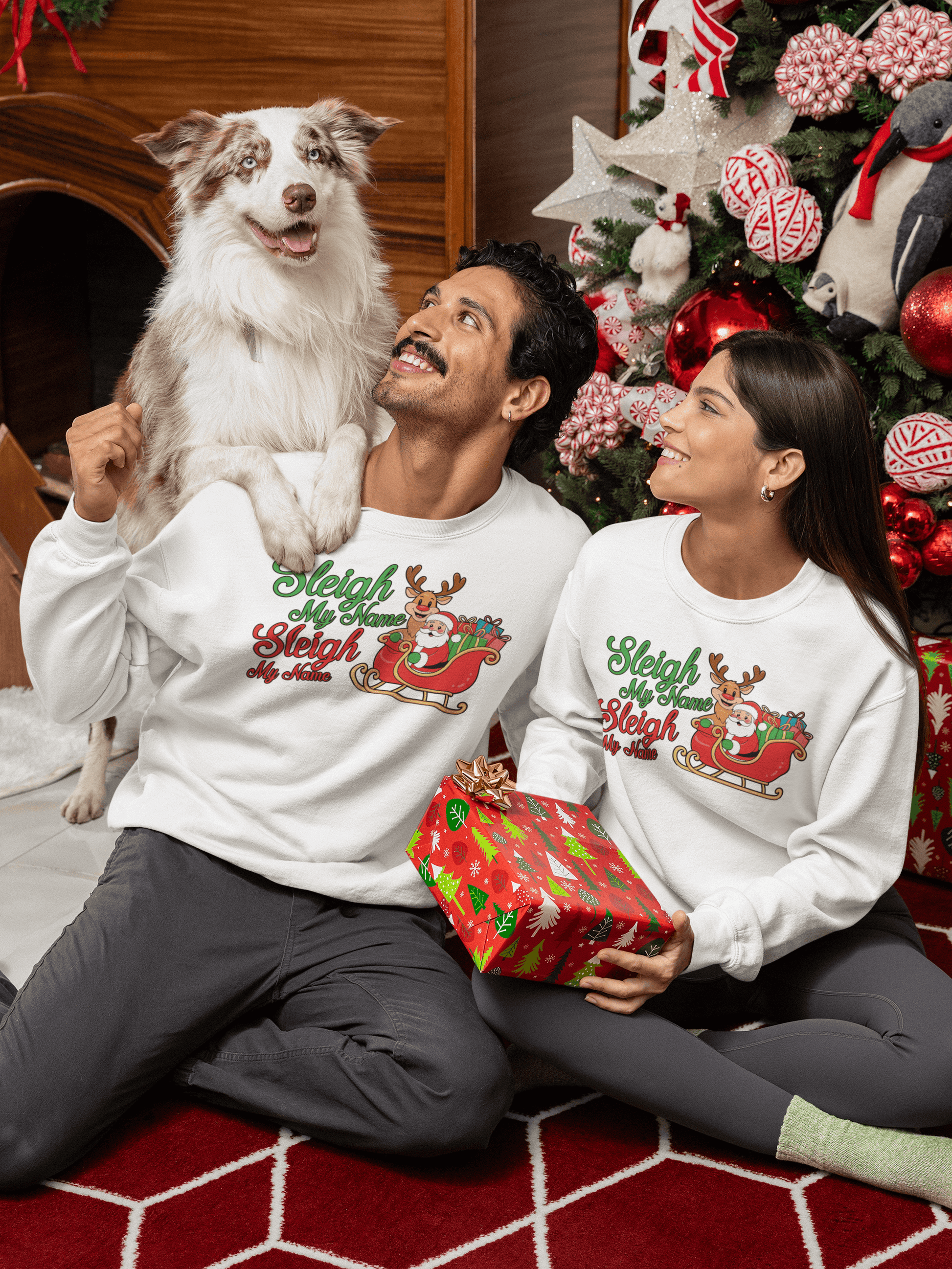 Bring some playful holiday cheer to your wardrobe with our 'Sleigh My Name Sweatshirt! Featuring a vibrant design of Santa and his reindeer riding a sleigh packed with gifts, this fun and festive shirt is perfect for spreading smiles and laughter. Whether you're rocking it at a Christmas party or giving it as a gift, this design adds a unique twist to holiday fashion. Grab yours today and sleigh the season in style!