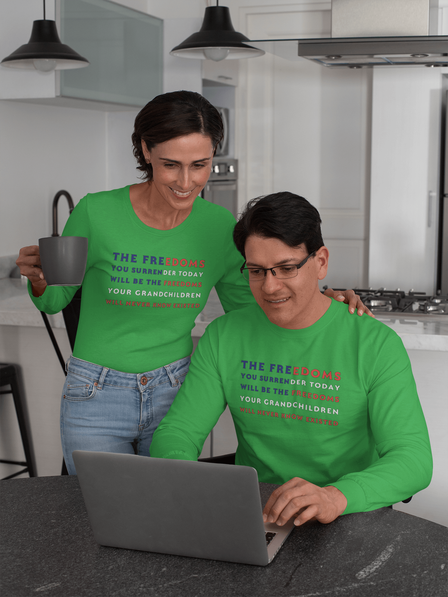 In a world where the balance between safety and liberty is often debated, this T-shirt serves as a powerful reminder of the lasting impact of our choices. Emblazoned with the poignant message, "The Freedoms you surrender today will be the freedoms your grandchildren will never know existed," this tee is more than just apparel—it's a statement piece.