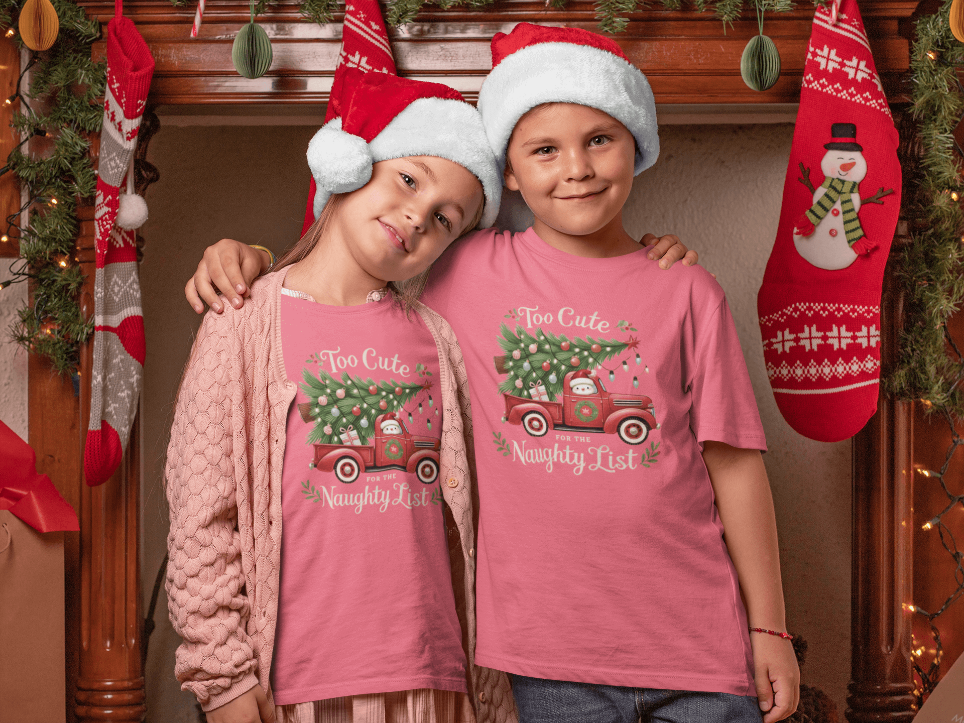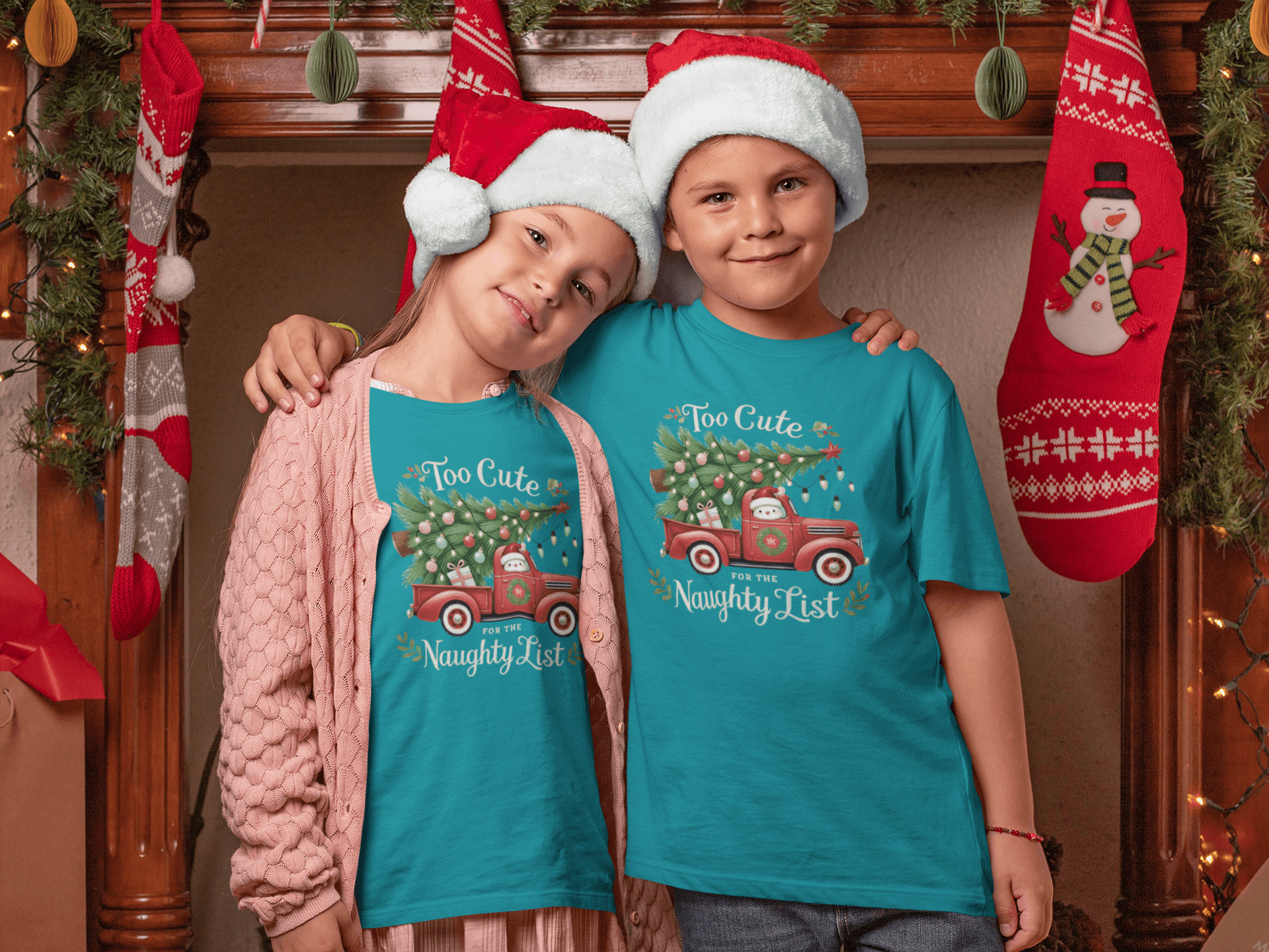 This adorable kids' Christmas T-shirt is perfect for little ones who are just Too Cute for the Naughty List! Featuring a festive red vintage truck loaded with a beautifully decorated Christmas tree and cheerful holiday accents, this design is brimming with holiday charm. The playful slogan and whimsical details make it a delightful choice for girls and boys who light up the holiday season with their sweetness. Soft, comfortable, and full of Christmas cheer, this shirt is ideal for festive family gatherings, holiday photos, or just spreading joy wherever your little one goes!
