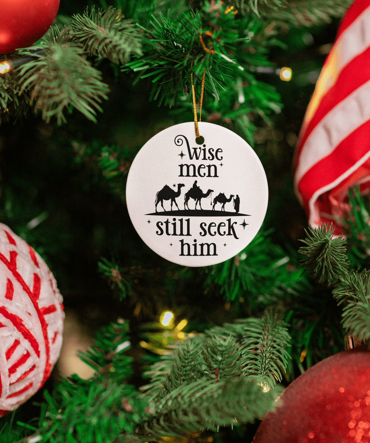Celebrate the true meaning of Christmas with this timeless 'Wise Men Still Seek Him' ceramic ornament. Featuring an elegant silhouette of the three wise men journeying under the starlit sky, this piece serves as a reminder of faith and devotion. Perfect for adding a spiritual touch to your holiday décor, it makes a meaningful gift for loved ones. Durable and beautifully crafted, this ornament is designed to last for many Christmases to come."